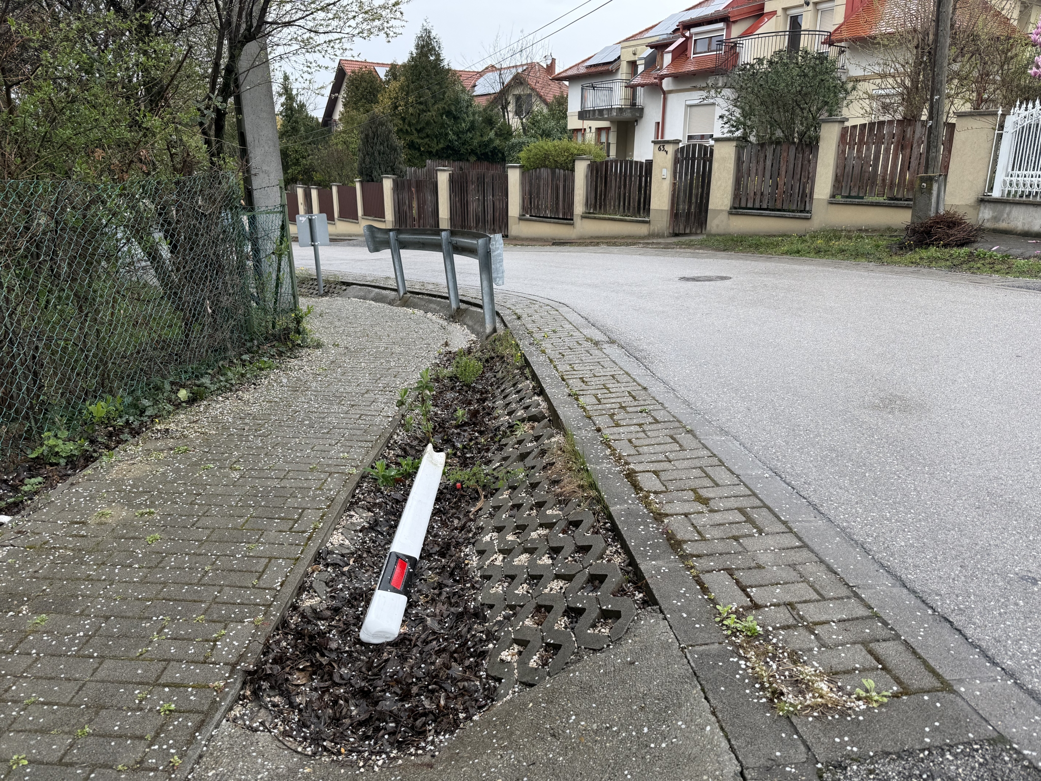 1164 Budapest, Cukornád utca 61 számmal szemben kidőlt egy az út szélét jelző fehér műanyag oszlop.