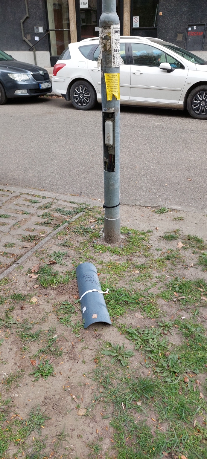 A villanyoszlopról leesett a védőburkolat.