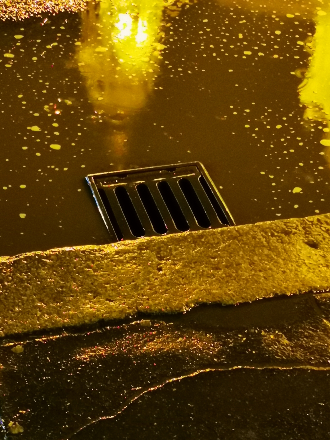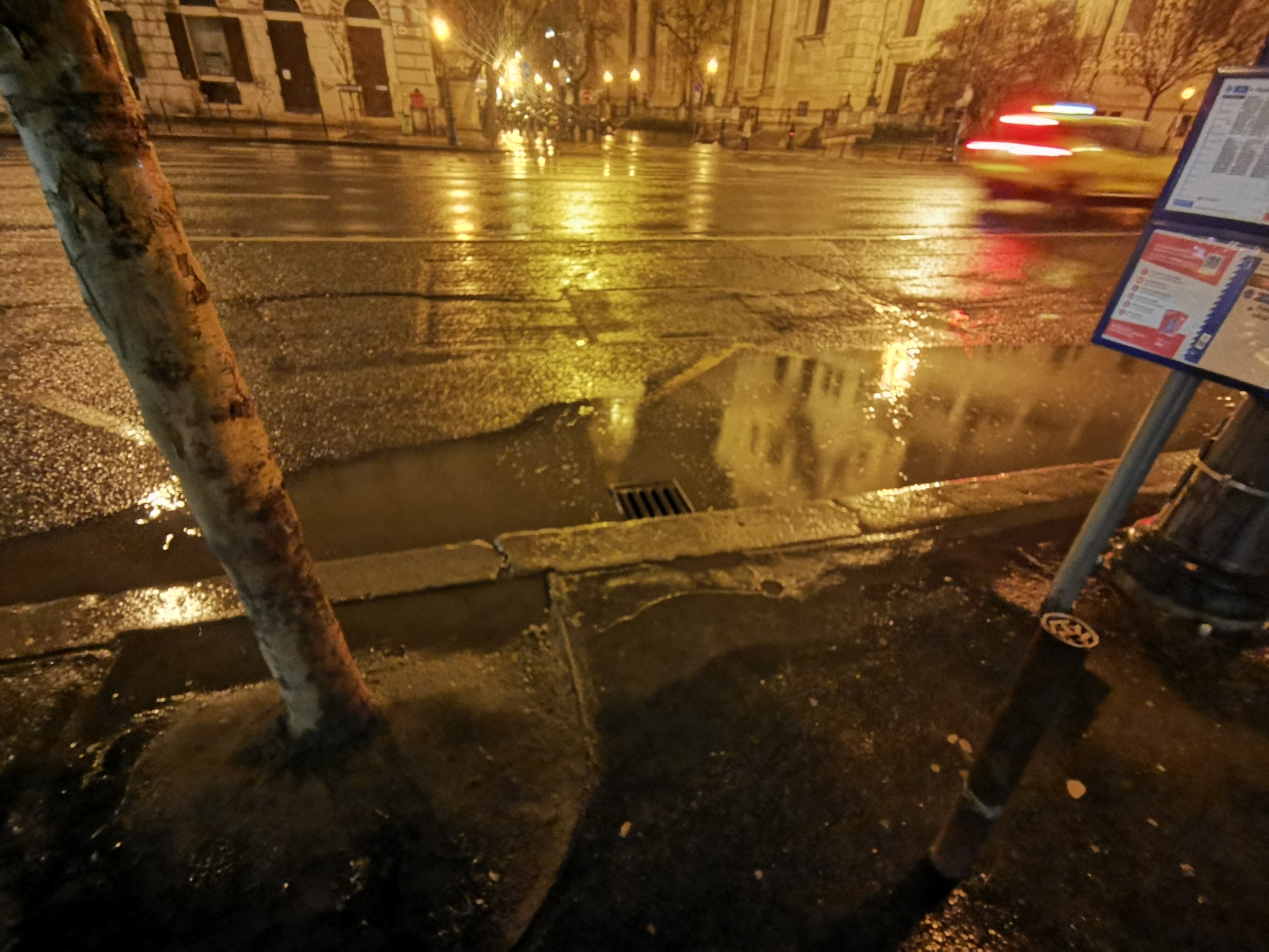 Bazilikaval szemben, 9/72 megalloban all az esővíz, mert az osszefolyo szegélye magasabb, mint az aszfalt. A beálló buszok rafrocskolik a vizet a varakozokra.