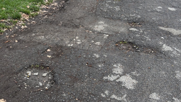 A XIX. kerület Szent Imre utca 1. szám előtti sarkon rengeteg kátyú van az úton.