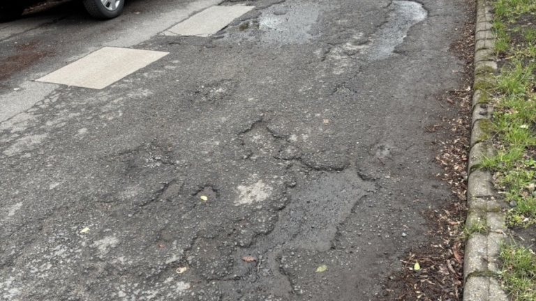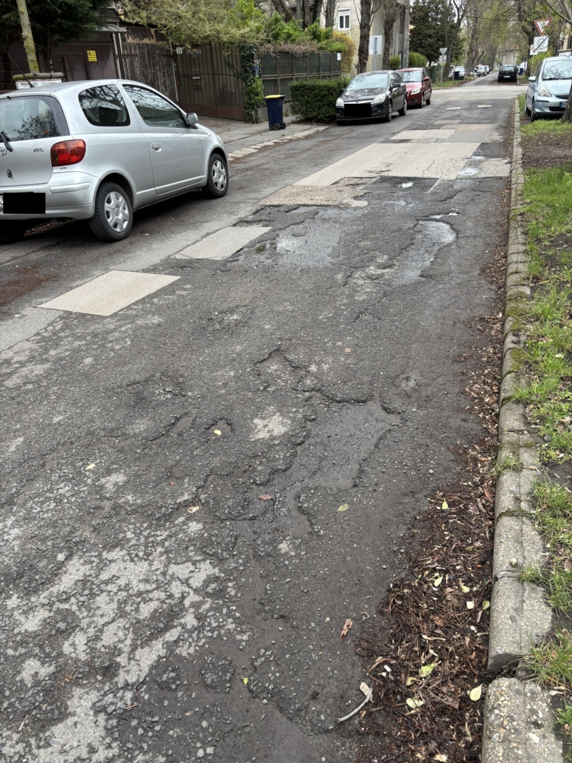 A XIX. kerület Géza utca 13. szám előtt és annak környéken az út szörnyű állapotban van. Tele van kátyúkkal.
