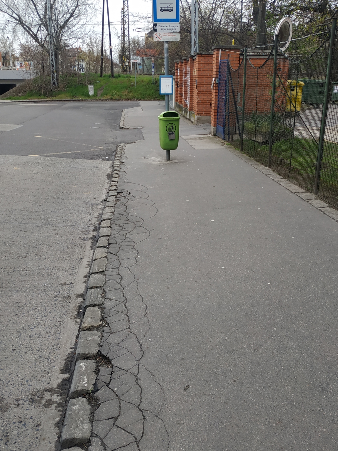 A 70-es troli végállomásánál pókhálószerűen fel van töredezve az aszfaltréteg, sérülésveszélyes.