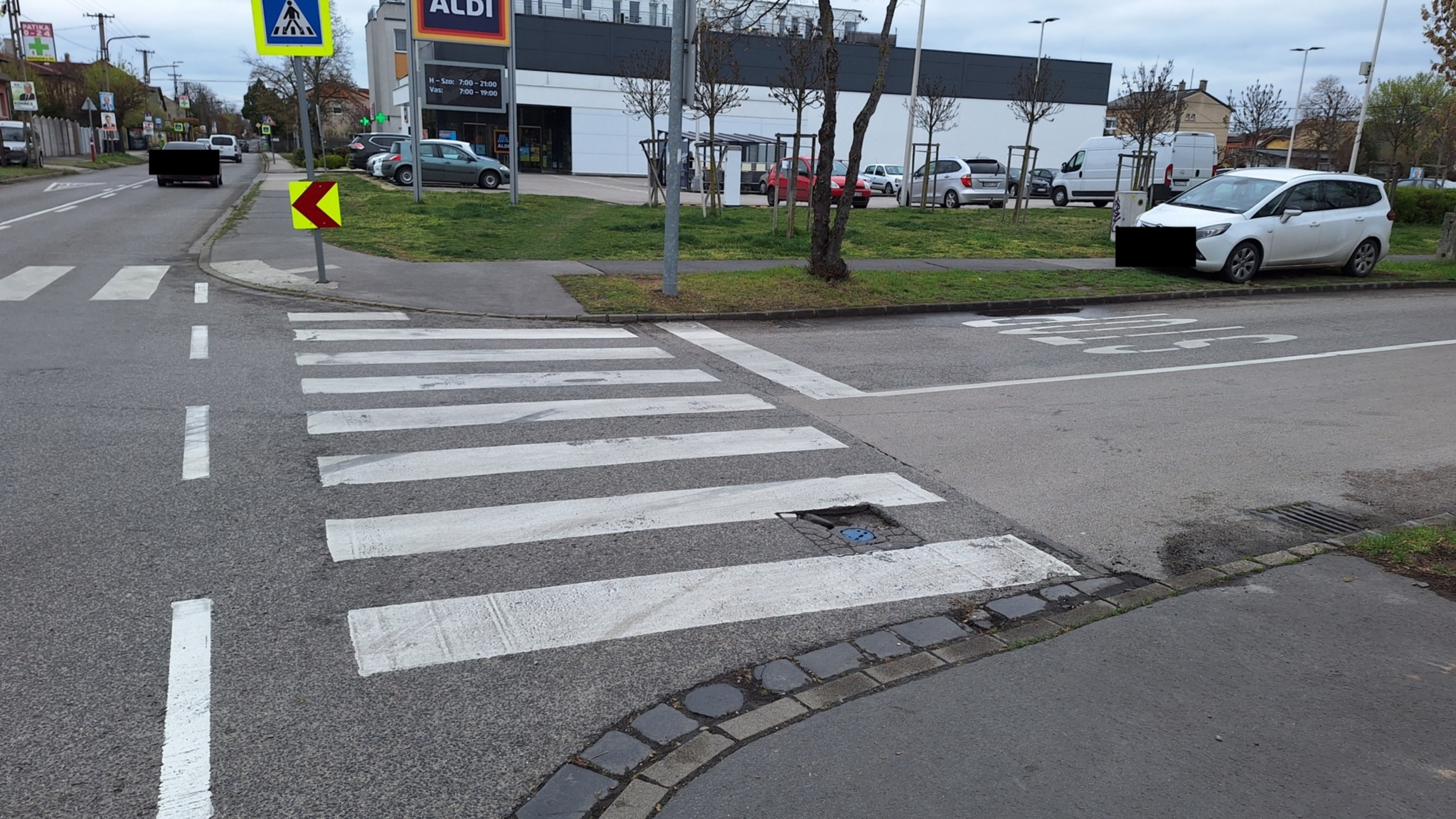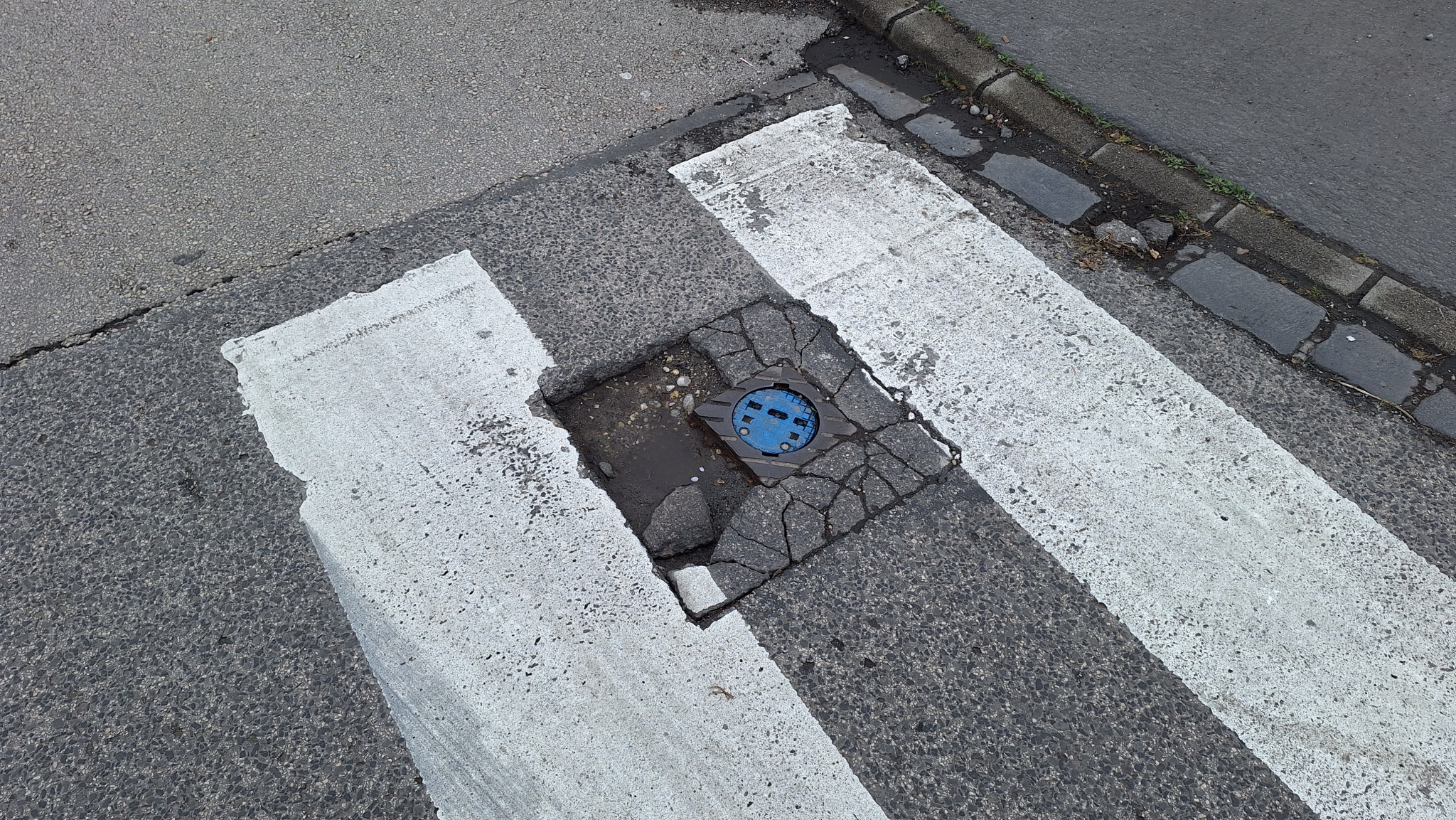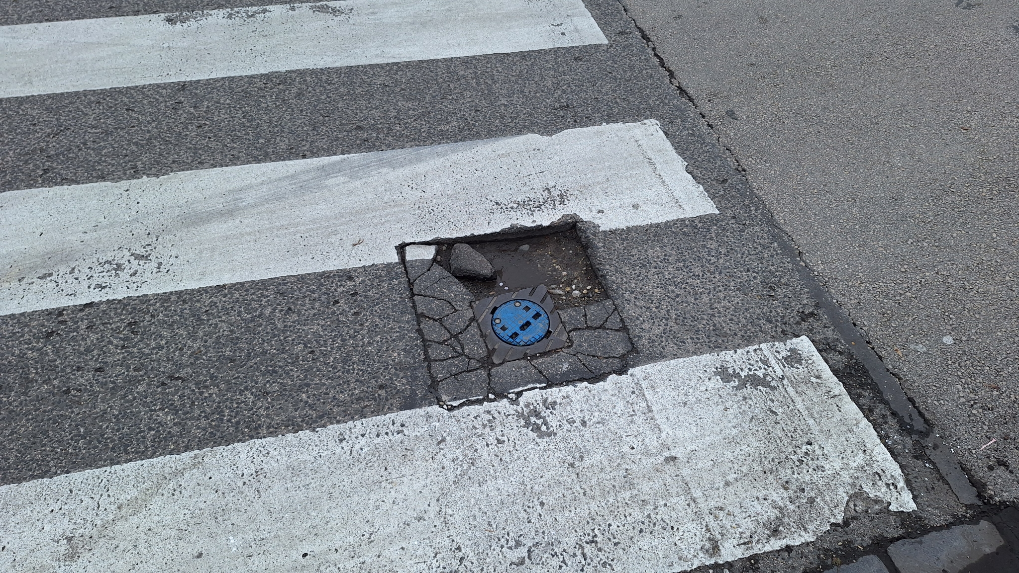 A Knézits és Klapka utca sarkán van egy kátyú.