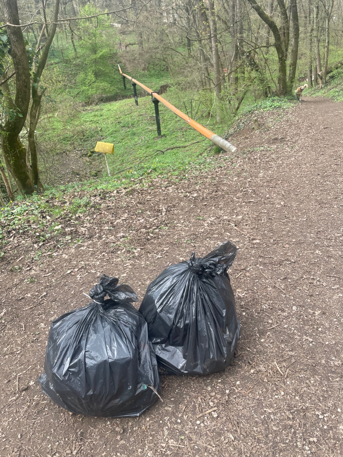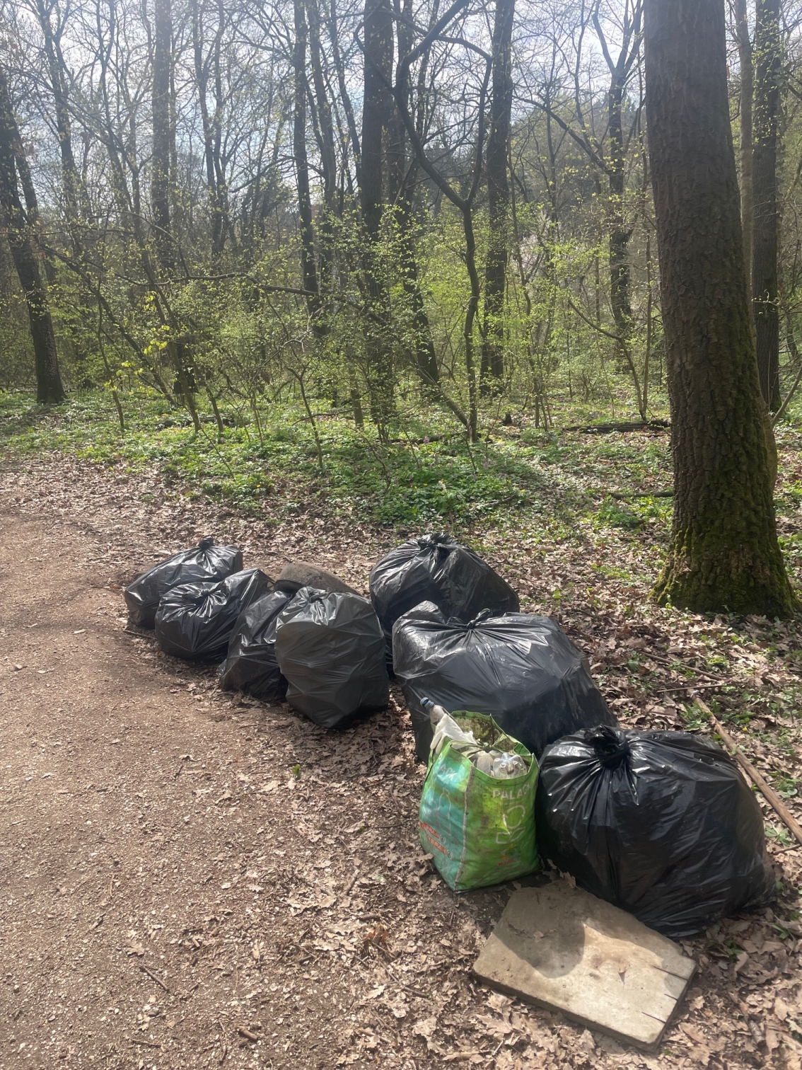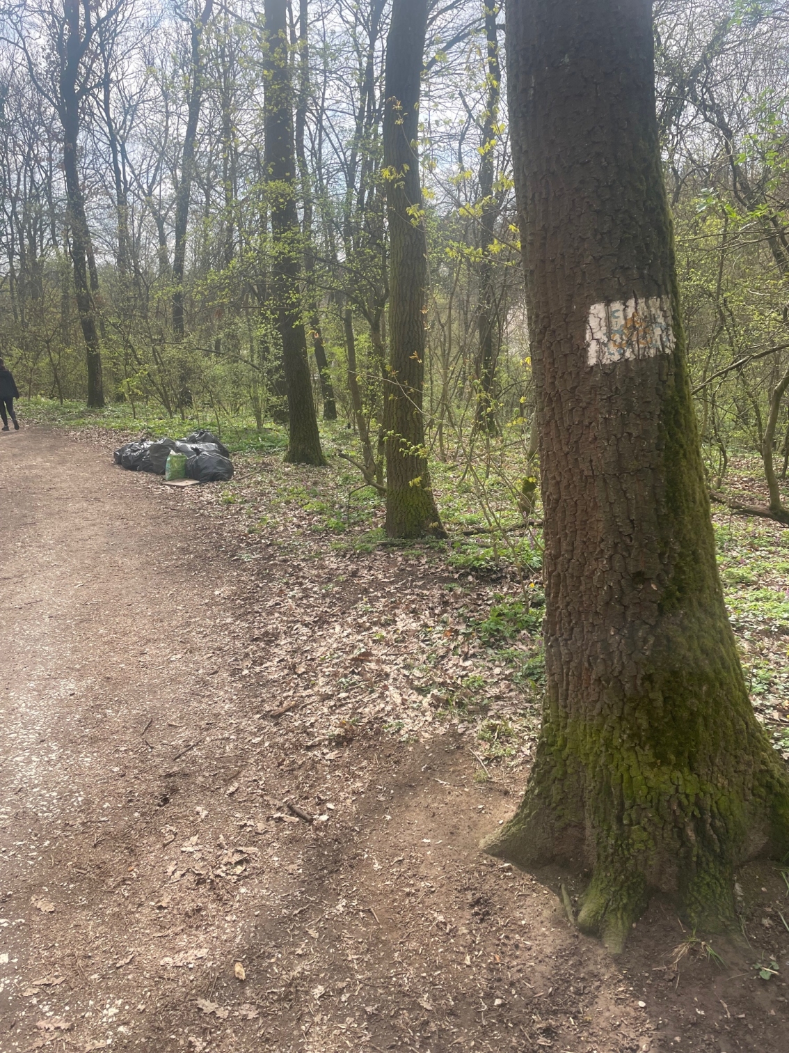 Erdei bicikliút mentén lerakott szemét zsákokban.