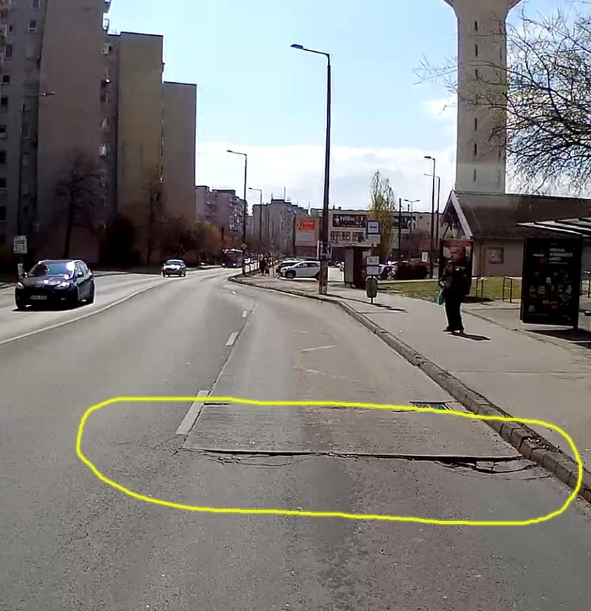 Egyre jobban kiszélesedő kátyús terület, kérjük javítani.