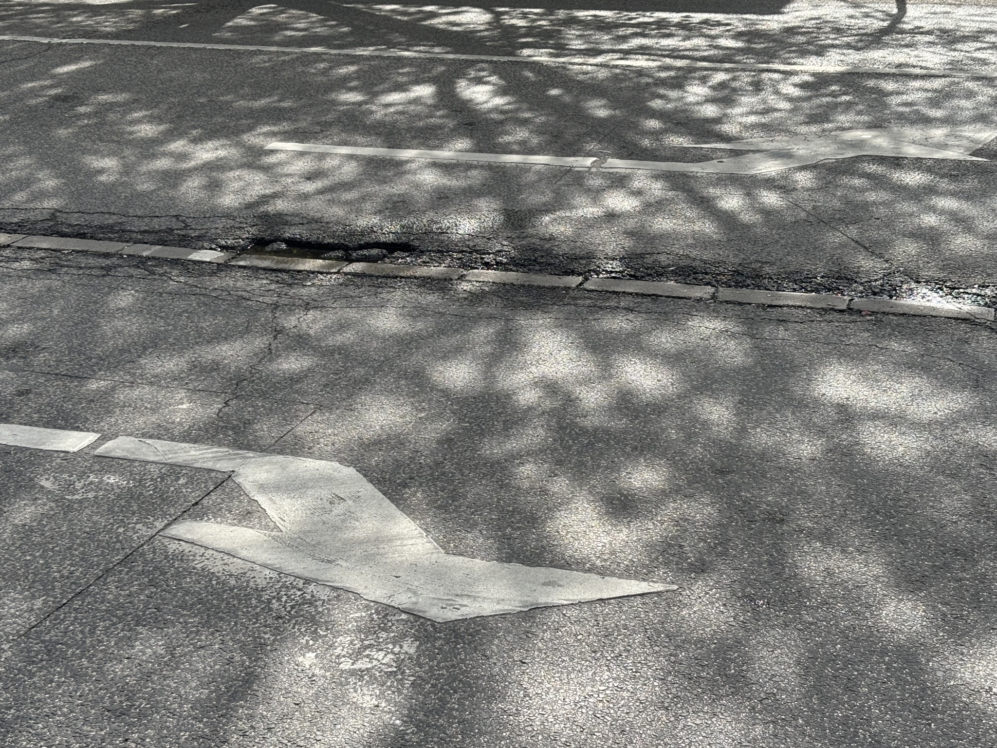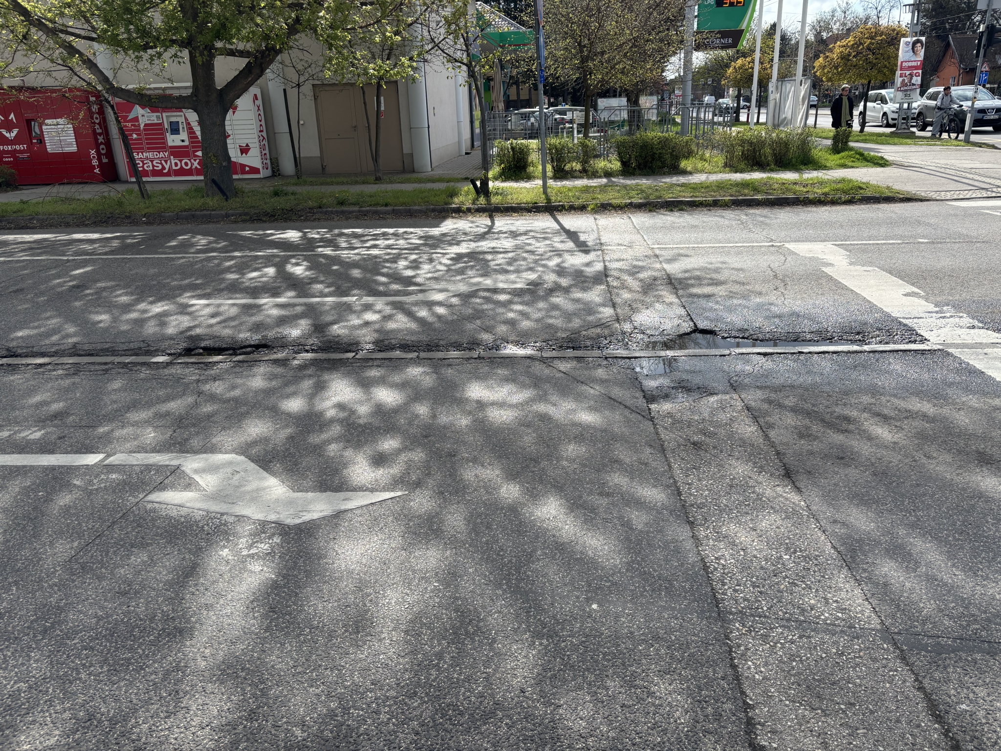A XIX. kerület Tálas utca és Ady Endre út sarkán a képen látható kátyúk vannak az úton.