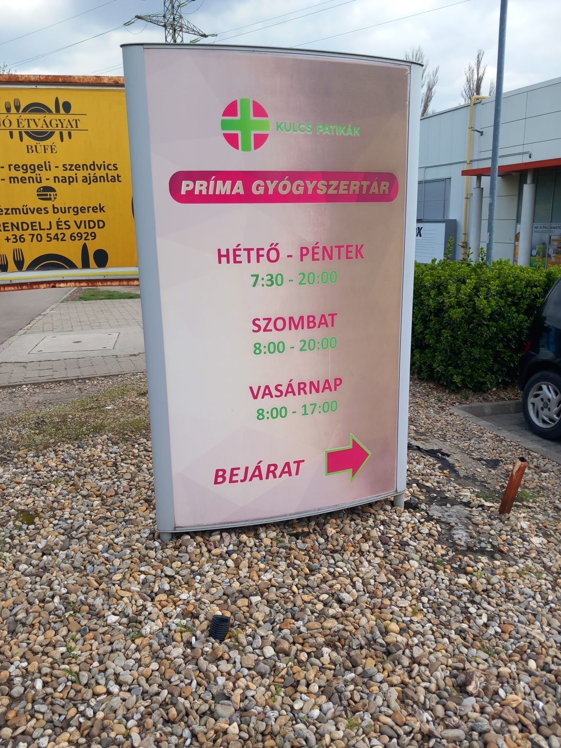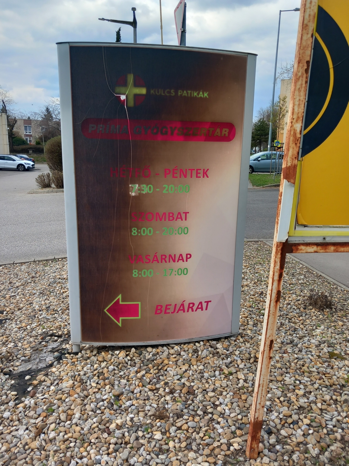Értesítem hogy az Auchan bejáratánál a Kulcs Patikai nyitvatartási plakát lassan nem lesz látható, Kulcs Patikai plakátnak az ízzó több éve nem világít.