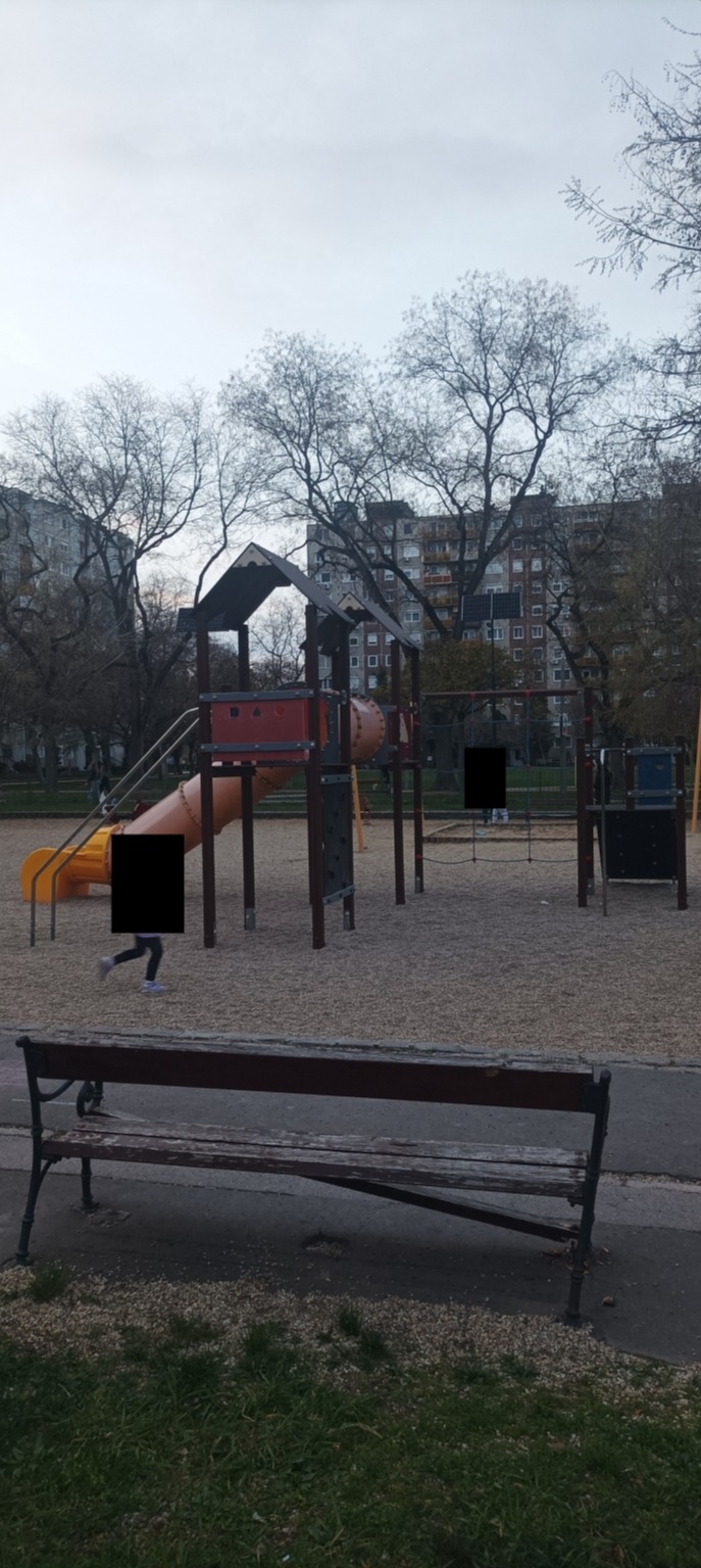Letört az egyik pad ülőkéje az újpesti Zörgő játszótéren.