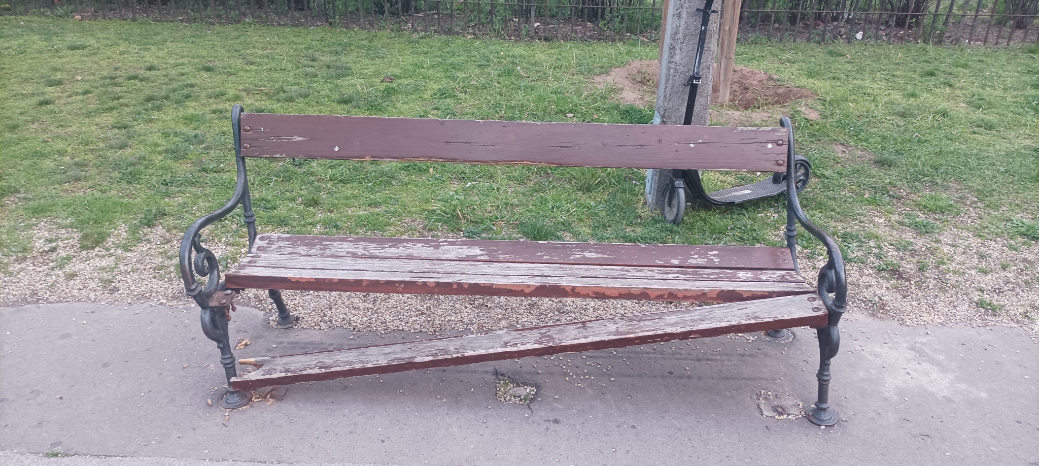 Letört ülőkéjű pad Újpest Zörgő játazótéren