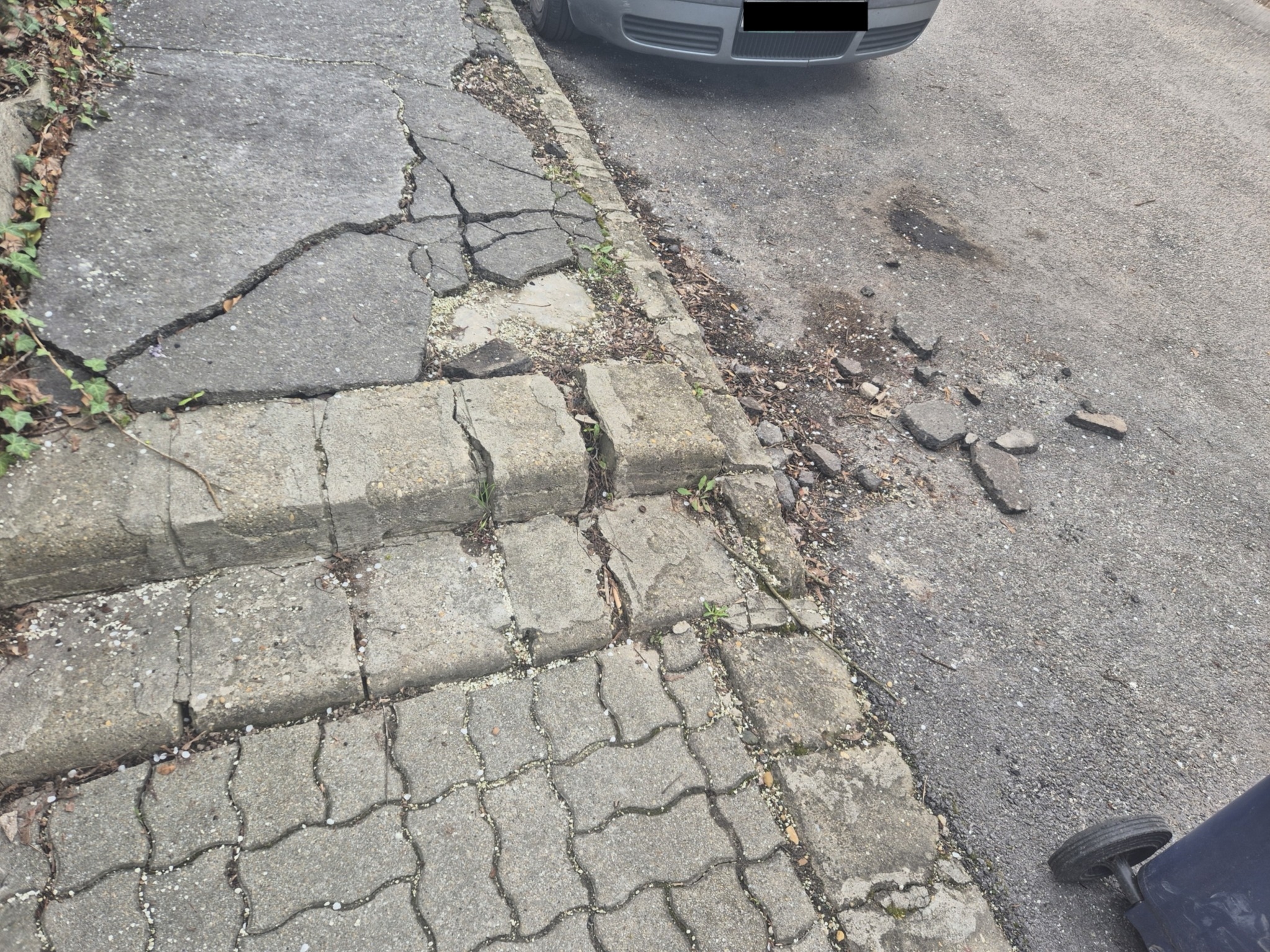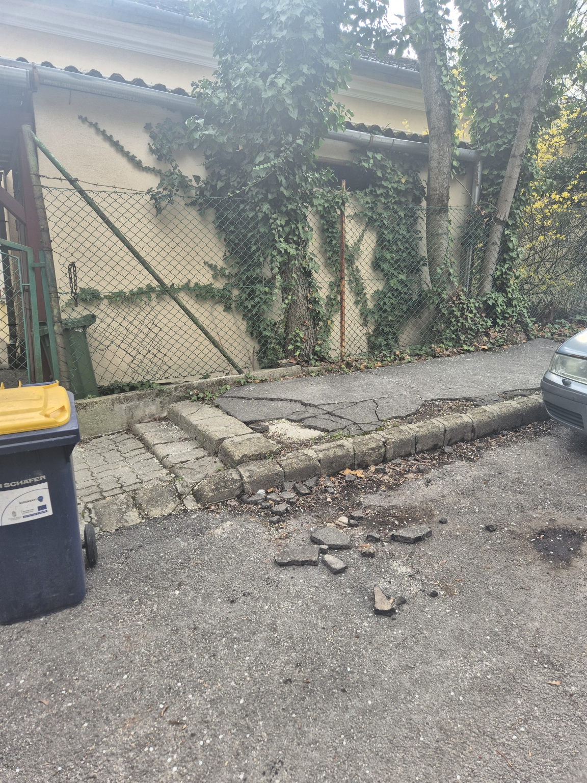 Szamóca utca alsó szakaszán széttört a járda, betondarabok még most is láthatóak az úton.