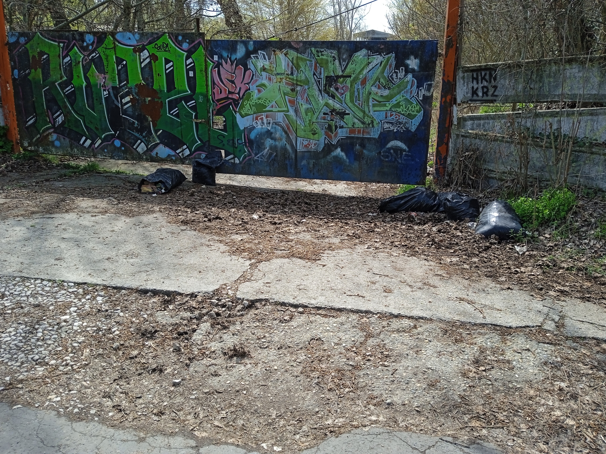 A Népsziget úton, a graffitis kapu mellett több zsáknyi szemét található.