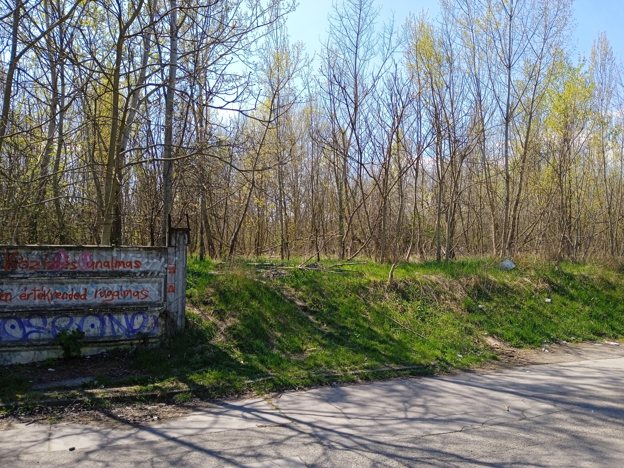 A Népszigeten, a fák között jelentős mennyiségű szemét található. A terület nehezen fotózható, de a helyszín egyértelműen beazonosítható.
