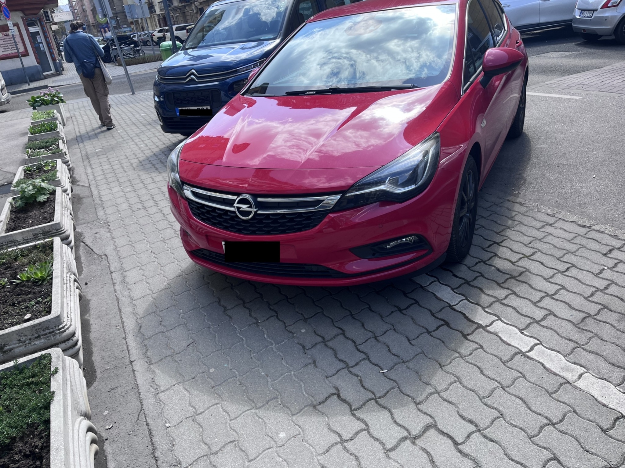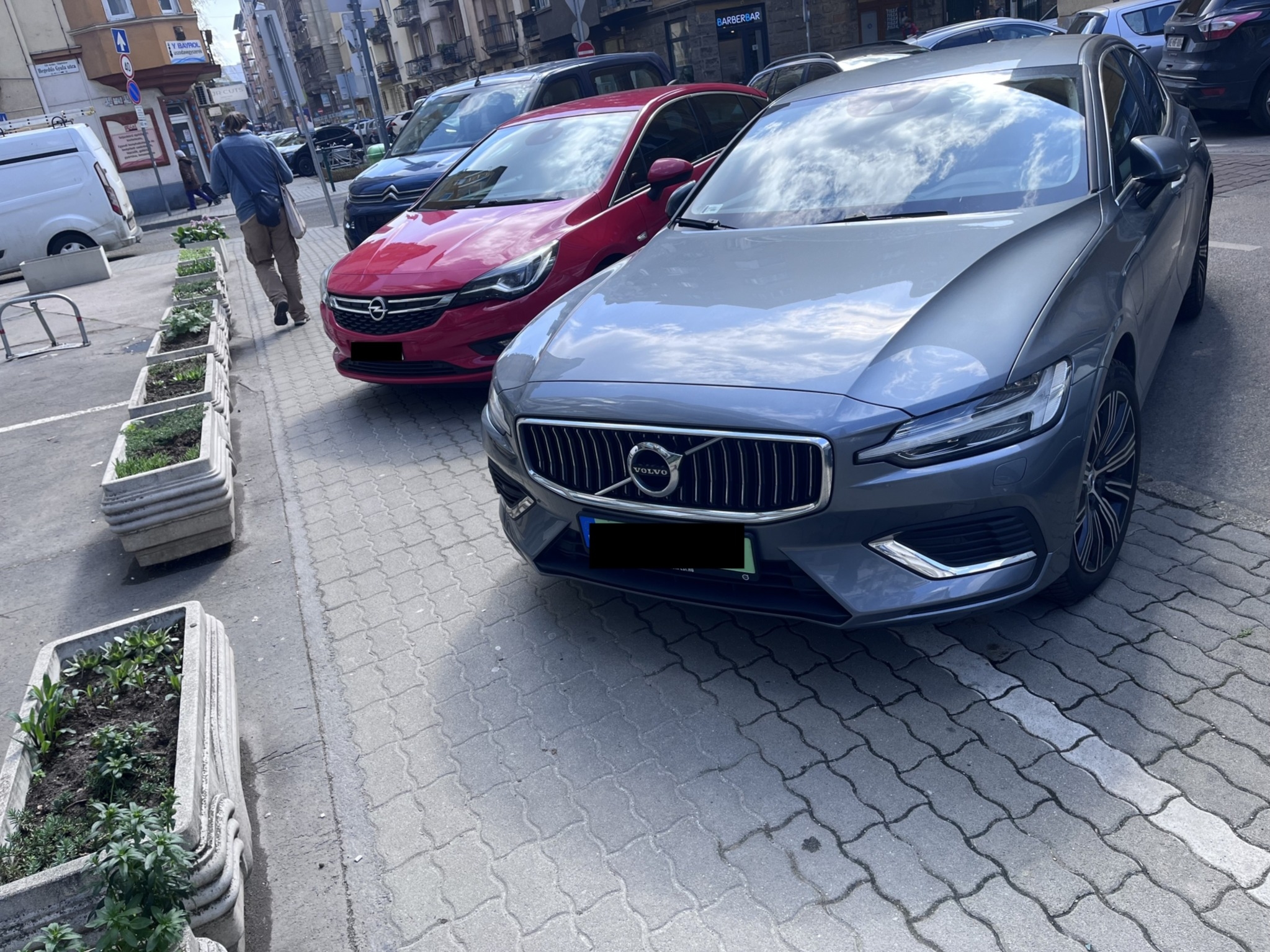 Szabálytalan parkolás a járdán (1136 Budapest, Balzac utca 17–19)