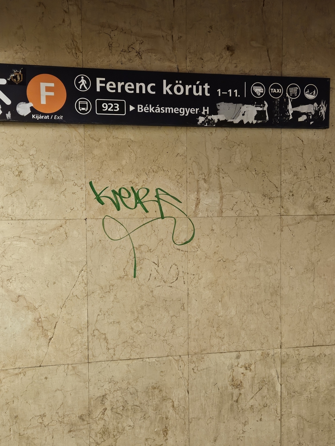 A Boráros téri aluljáró F lépcsője össze van firkálva és matricázva.