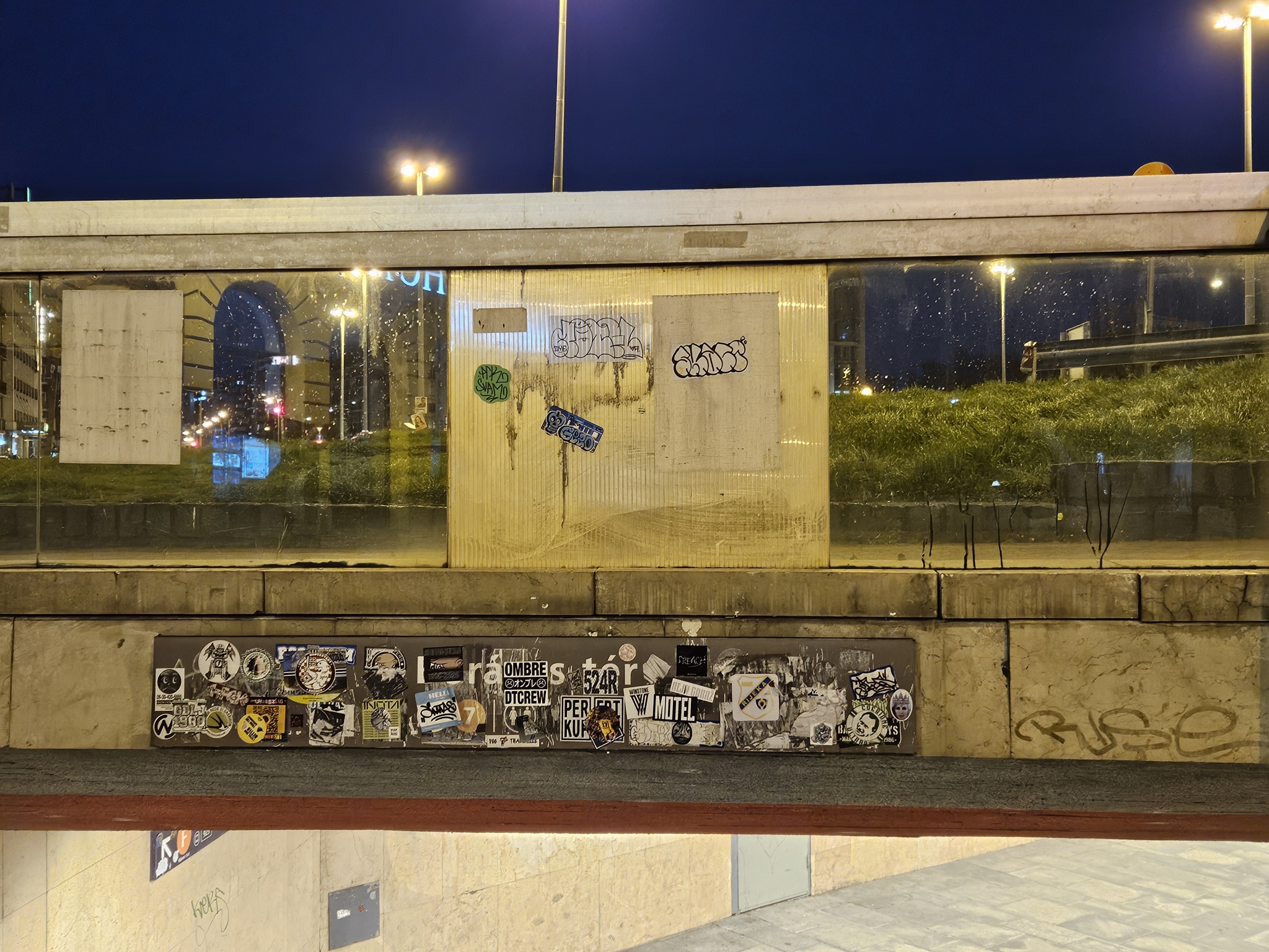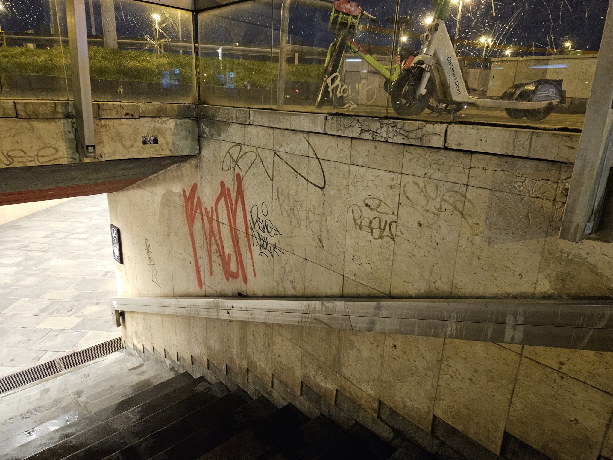 A Boráros téri aluljáró F lépcsője össze van firkálva és matricázva.