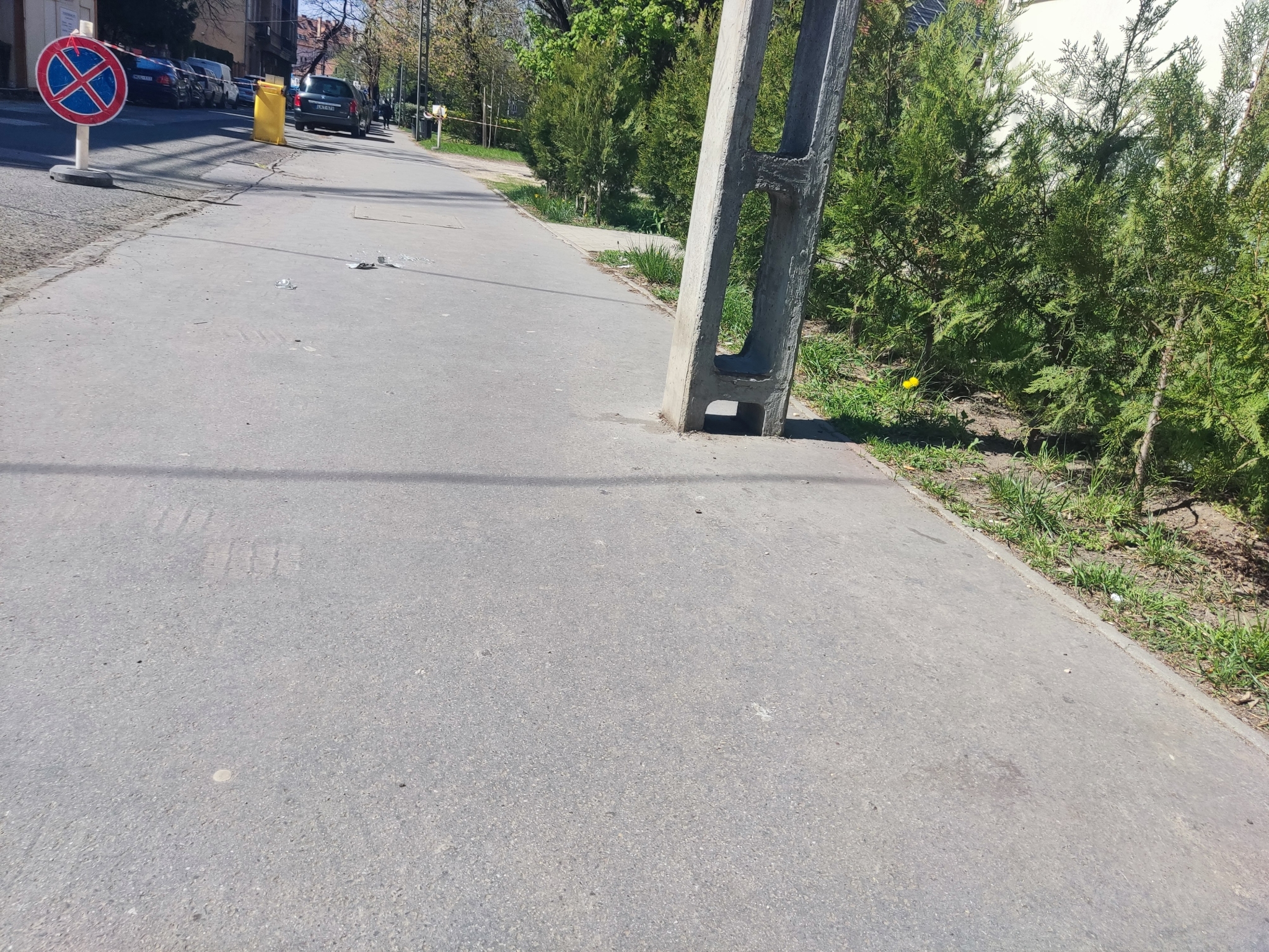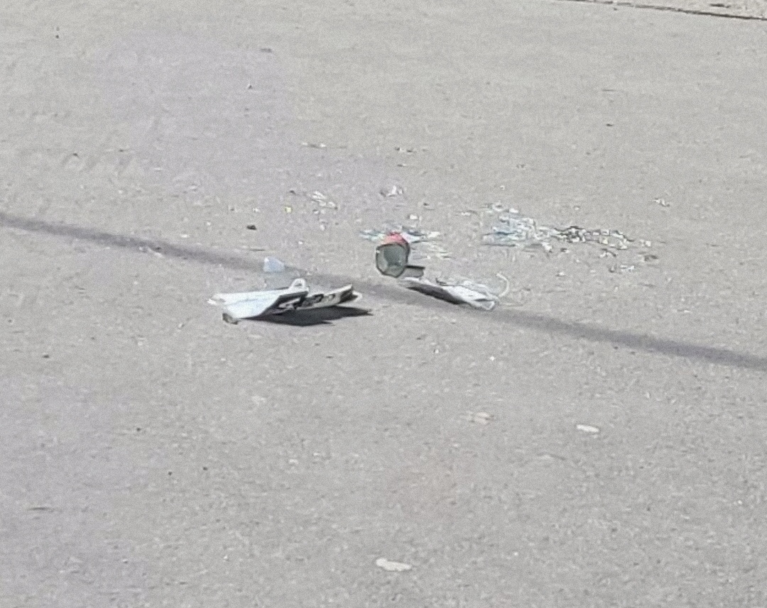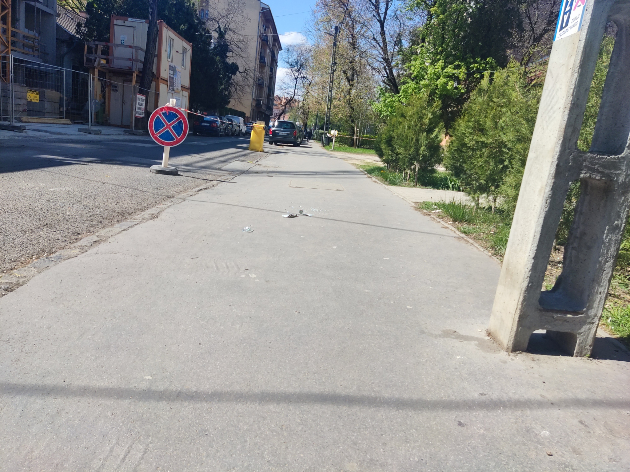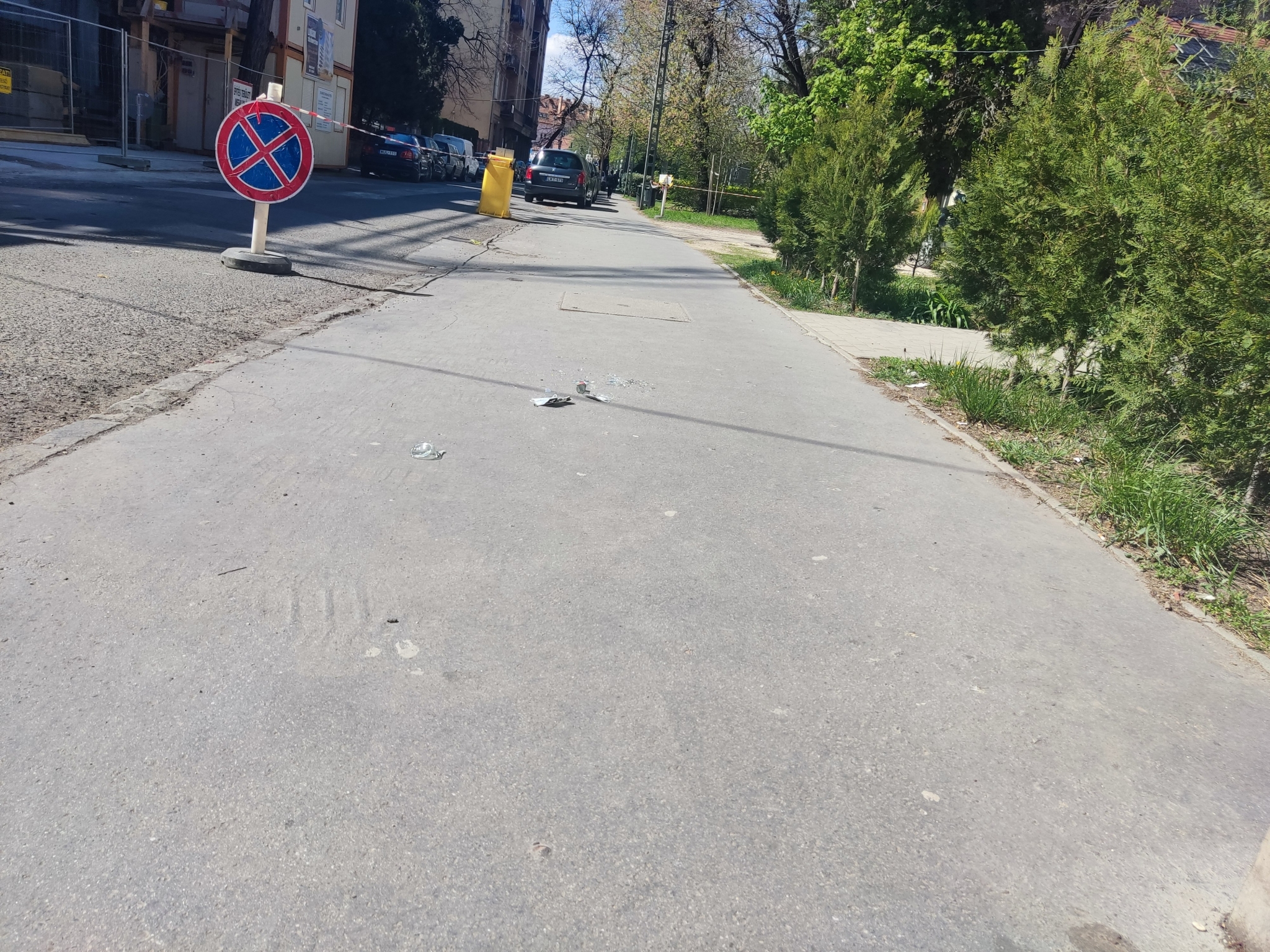 Üvegszilánkok, üvegtörmelék a járda közepén.