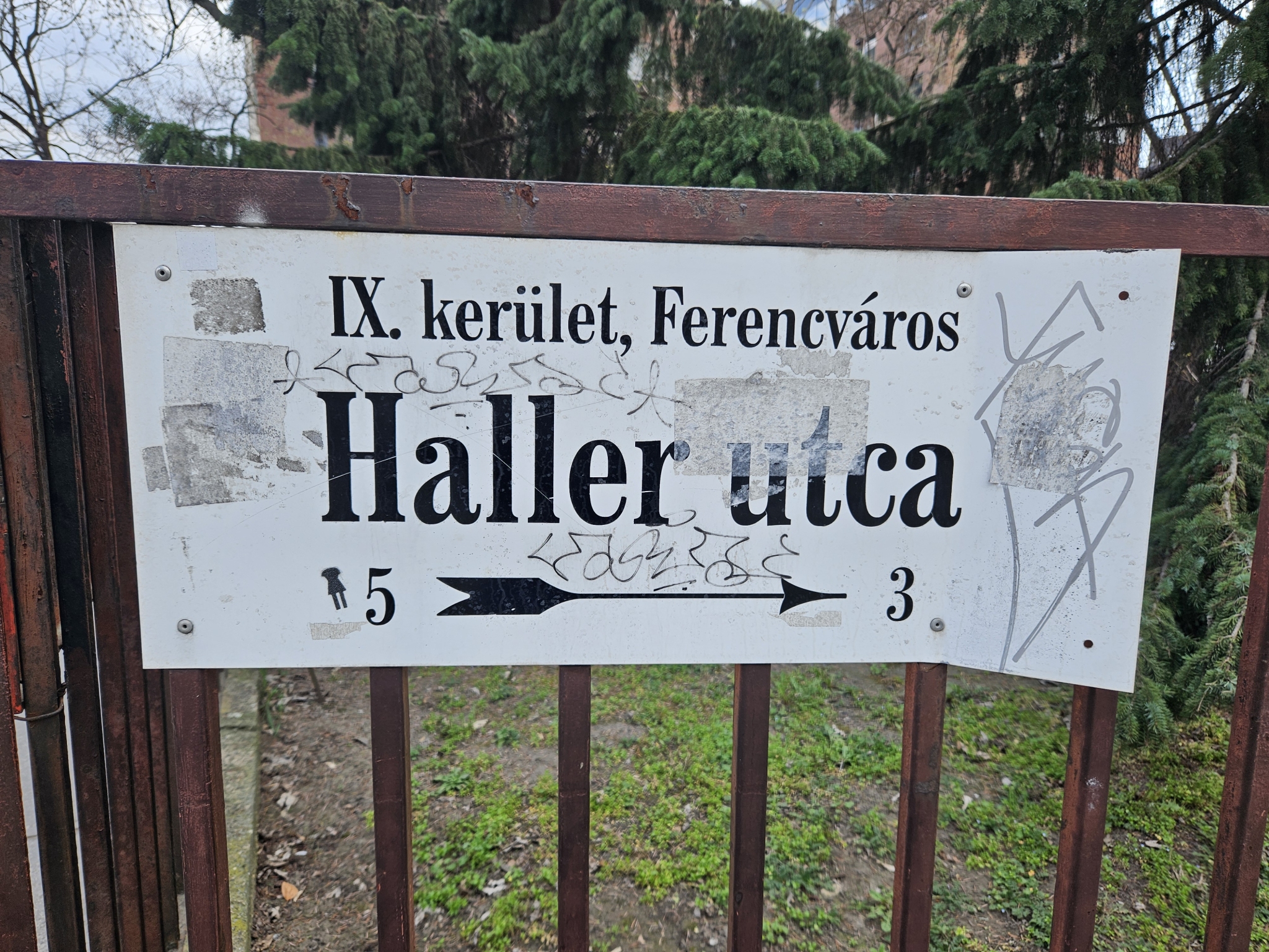 A Haller utca és a Vaskapu utca sarkon egy utcanévtábla van, firkálva és matricázva.