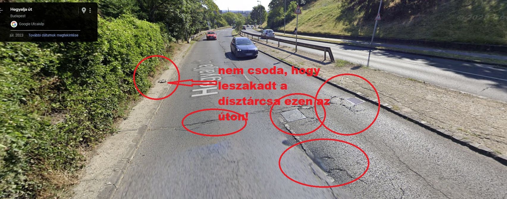 A Hegyalja úton van egy csatornafedél és egy lefolyórács egymás mellett, mindkettő környékén beszakadt az aszalt és korábbi javítások is vannak ott, amelyek miatt egy darab ép, illetve vízszintes szakasz nincs az aszfaltban.