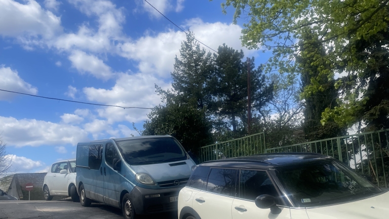 A járdát elfoglalva parkolnak az autók a szűk utcában, akadályozza a járókelők és az autós forgalom biztonságos közlrkedését.