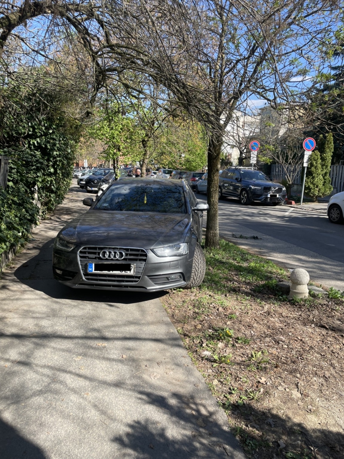 A járdát elfoglalva parkoló autók.