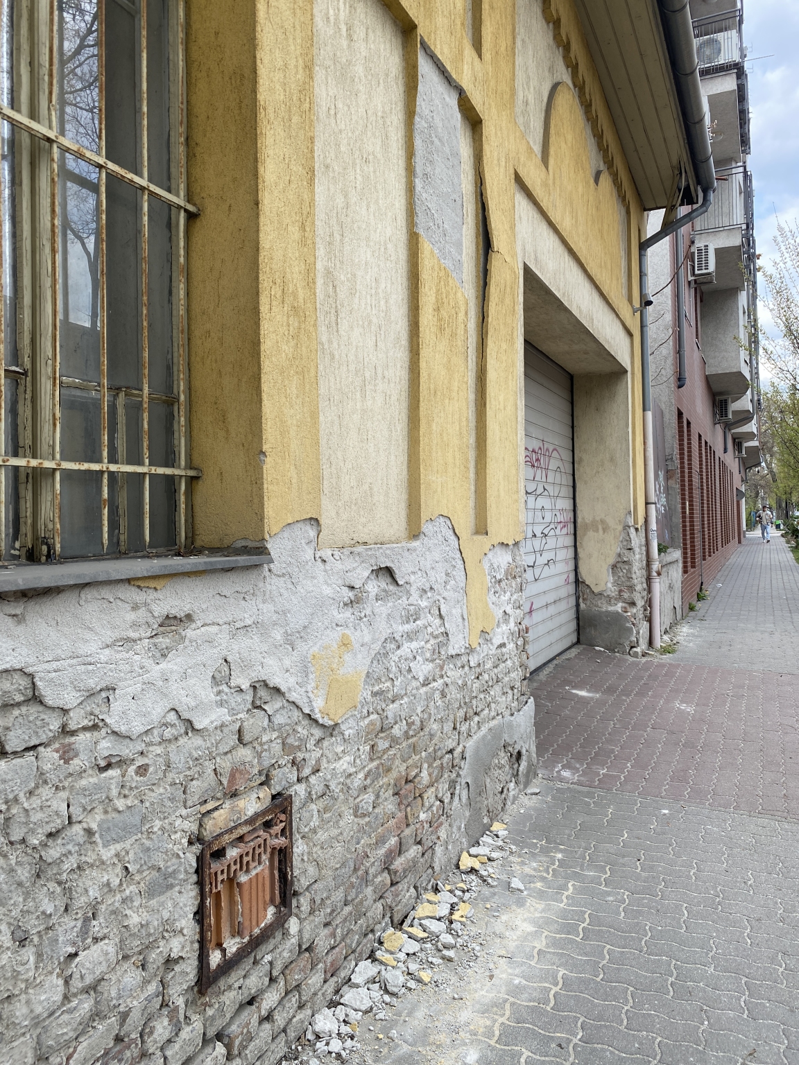 A Tüzér utca elején az egyik épület oldaláról potyog a vakolat, valamint a tetőszerkezet is nagyon rozoga, életveszély