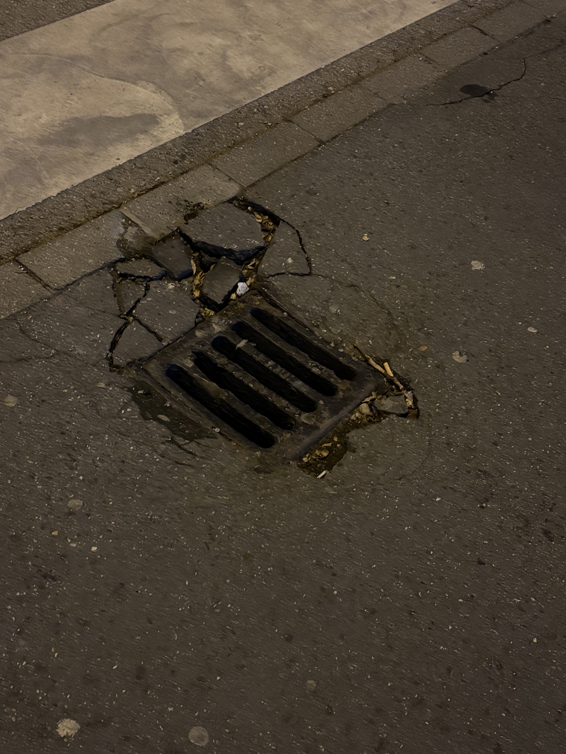A XIX. kerület Kossuth téri piac előtt levő vízelvezető teljesen elhasználódott és feltört az aszfalt körülötte.