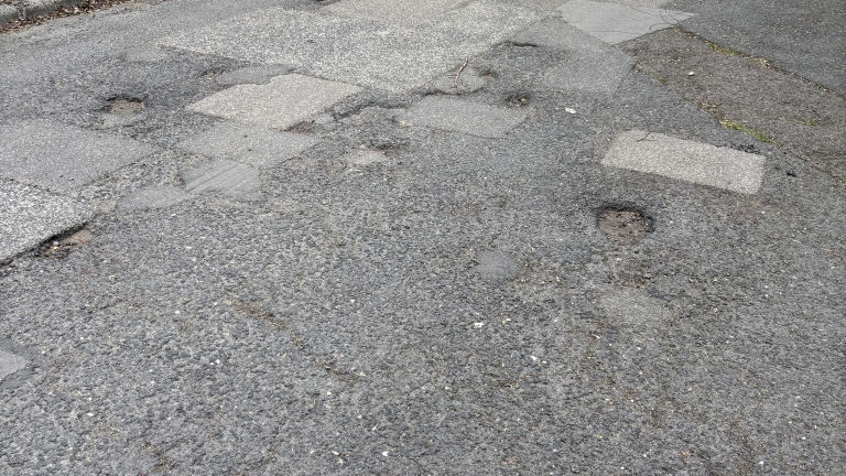 A XIX. kerület Vajk utca 2. szám előtt rengeteg kátyú van az úton.