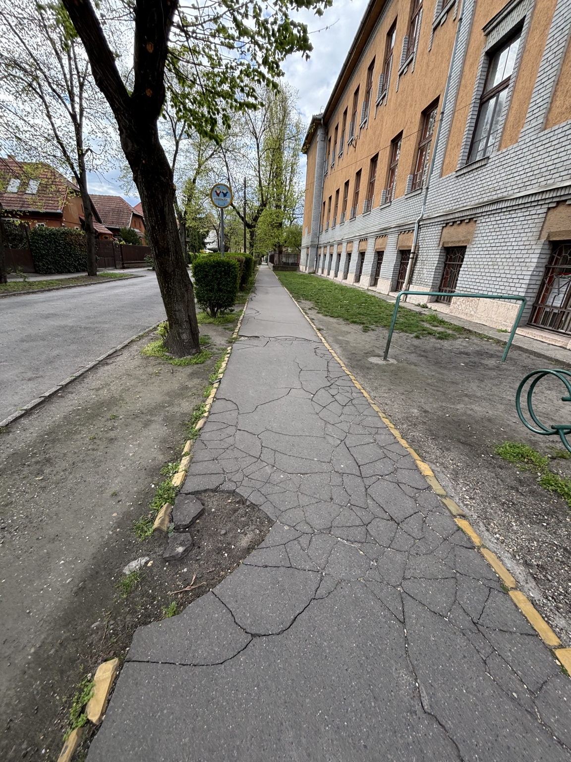 A XIX. kerület Vajk utca 11. szám előtt, az iskola oldalában a képen látható rossz állapotban van a járda.