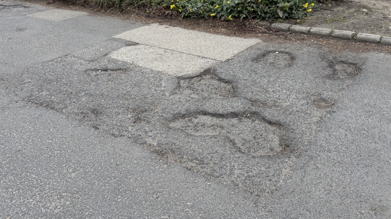 A XIX. kerület Géza utca 18 és 20. szám között a képeken látható állapotban van az út, amely továbbra is folyamatosan porlad szét. Célszerű lenne minél előbb kijavítani.