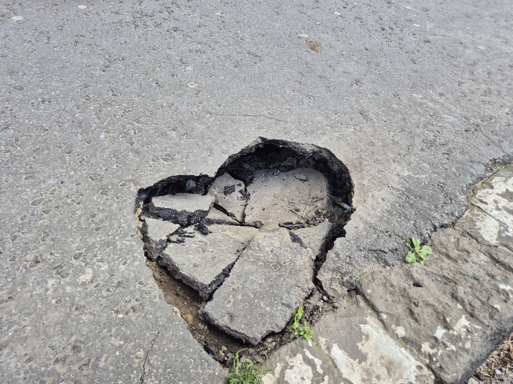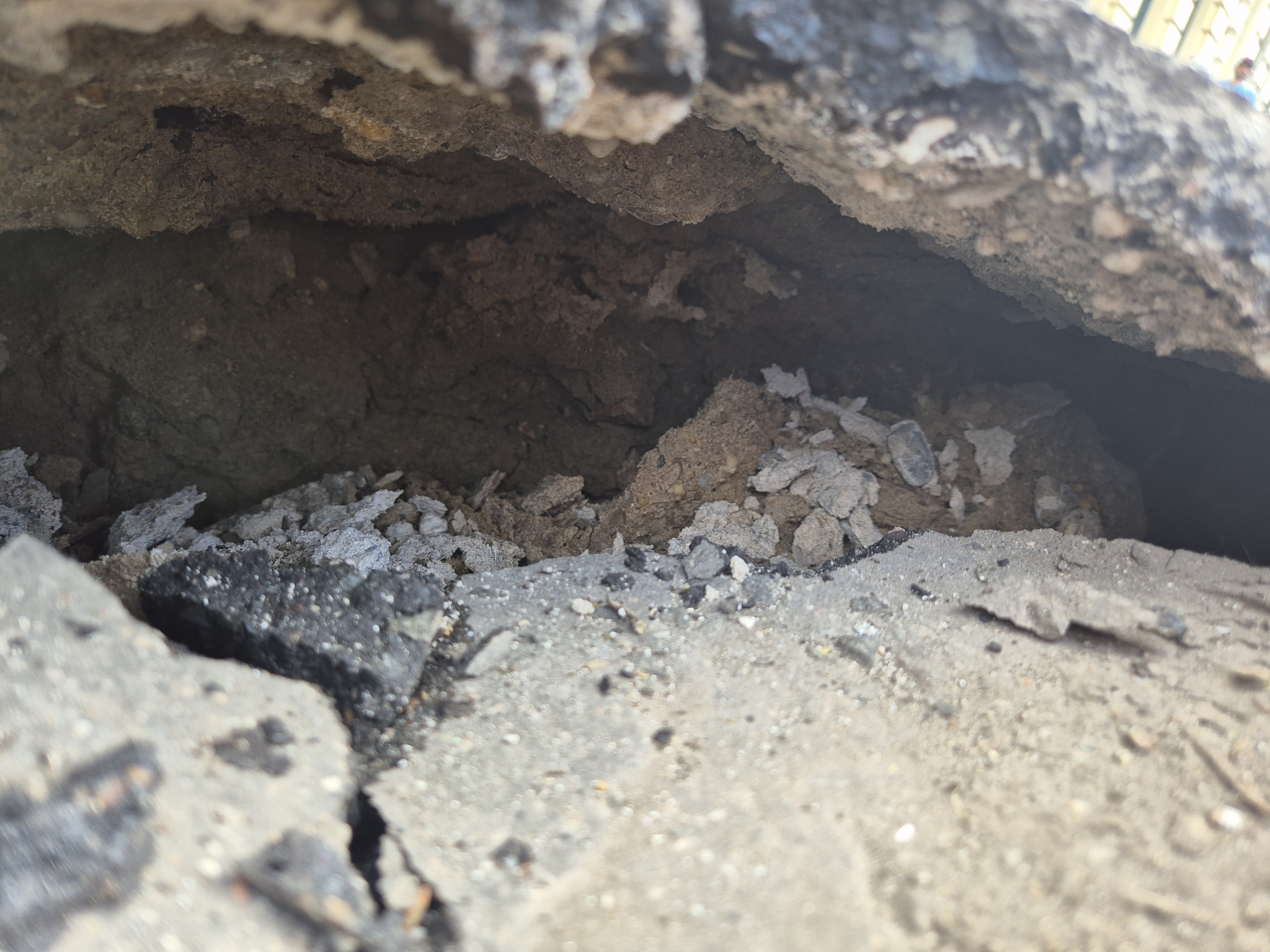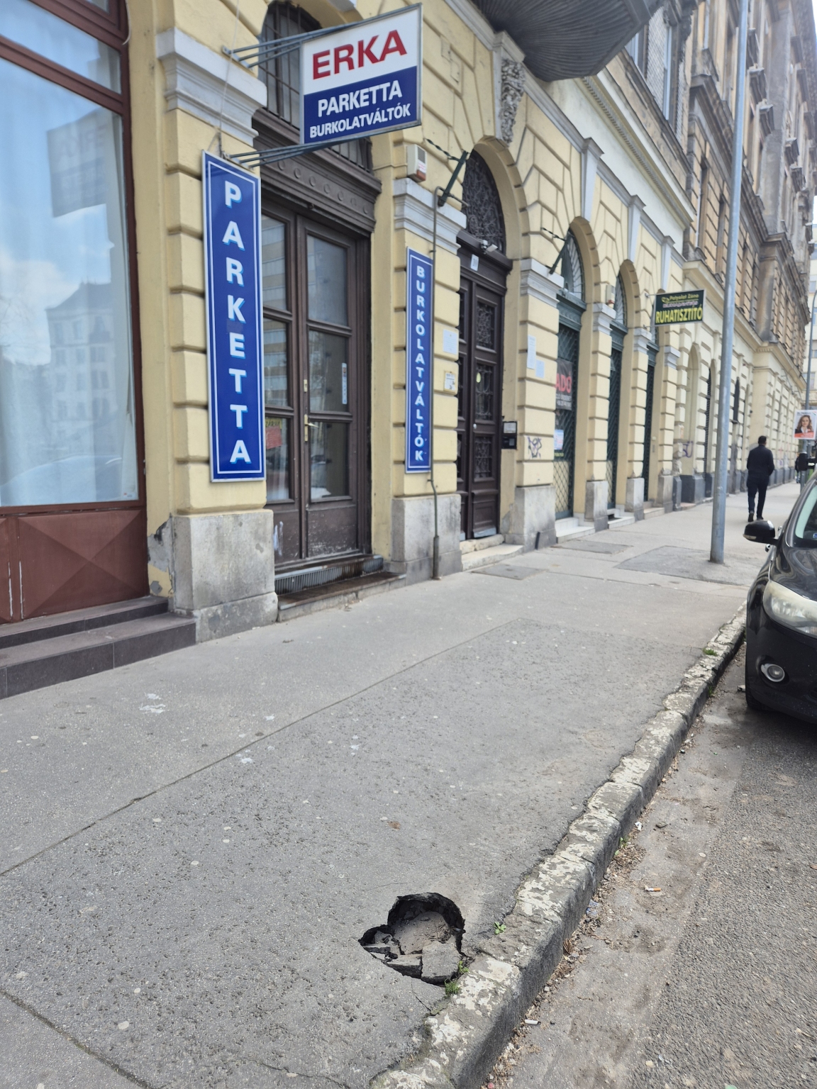 A képen látható járda alatt valószínűleg csőtörés történhetett, ezért a járda üreges lett és a felső burkolata elkezdett beomlani.