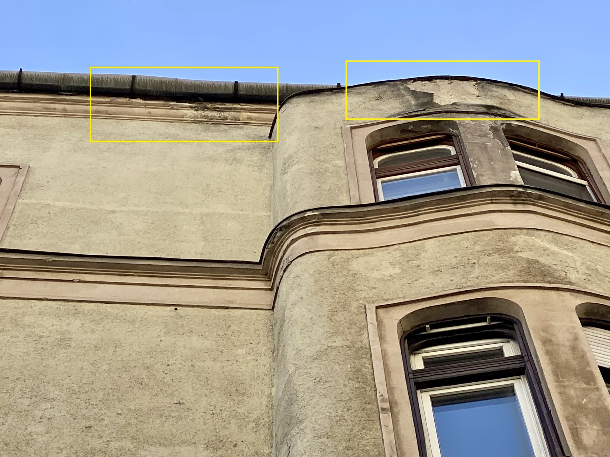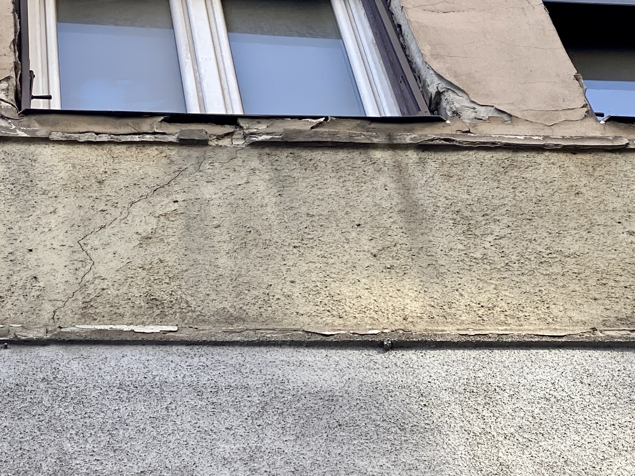 Életveszélyes, omladozó homlokzati vakolat.