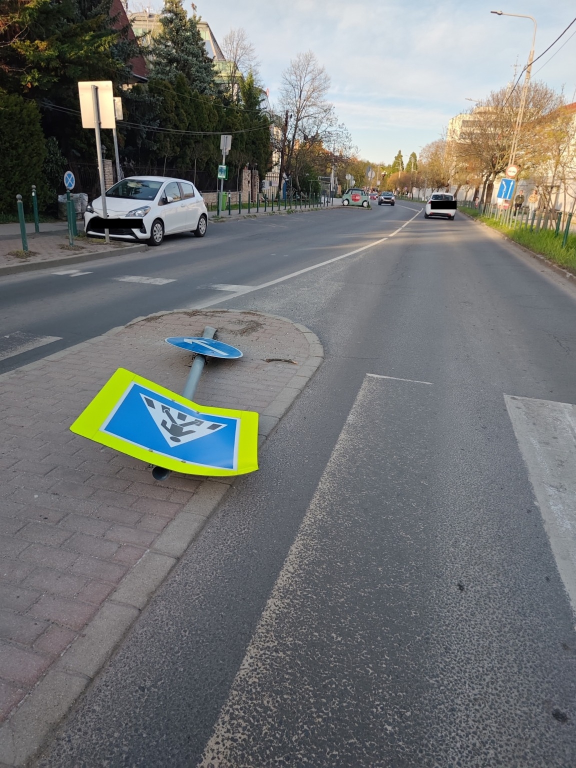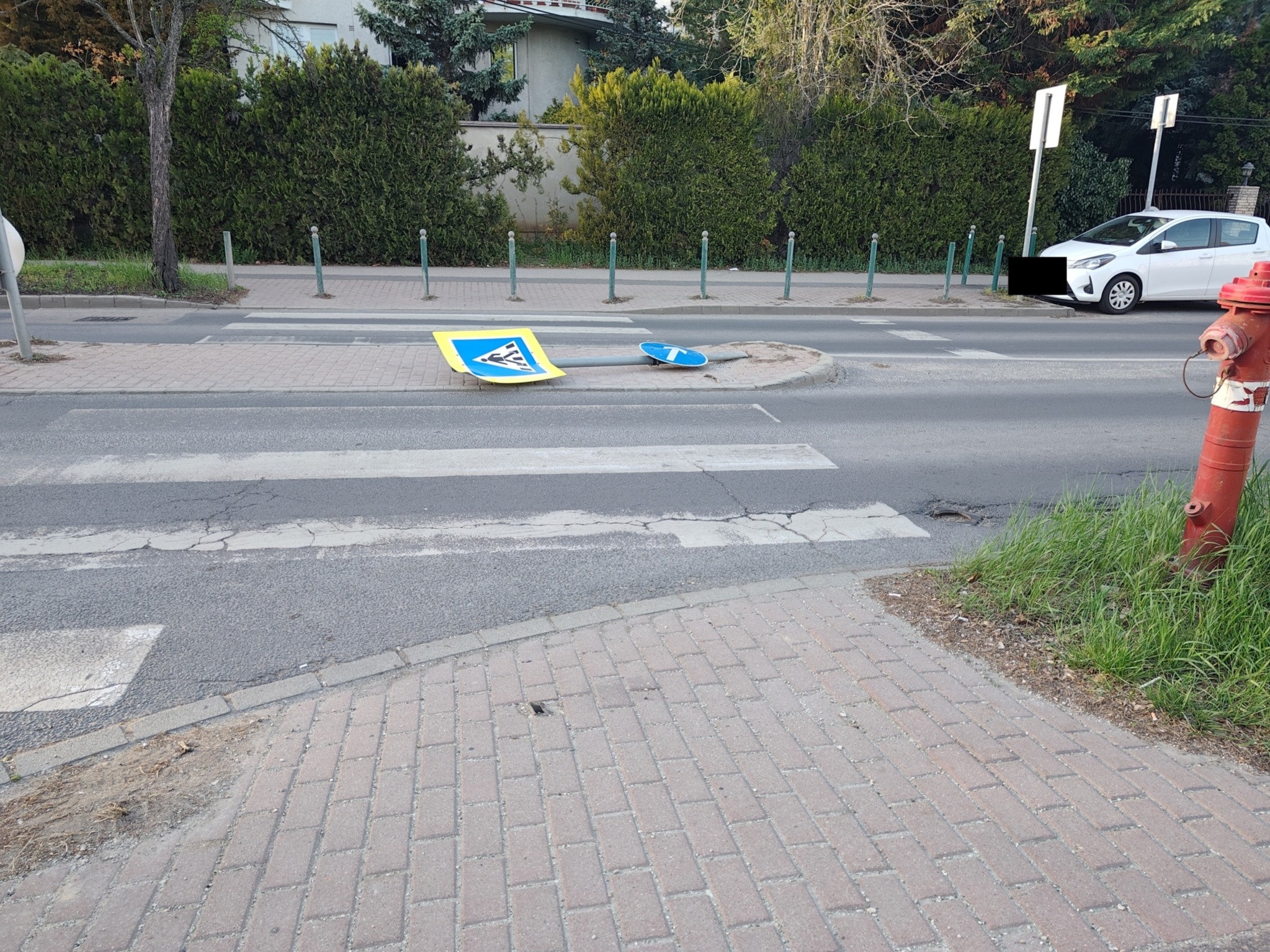 A gyalogátkelőhely szigeten a kresztáblát kidöntötte valaki.