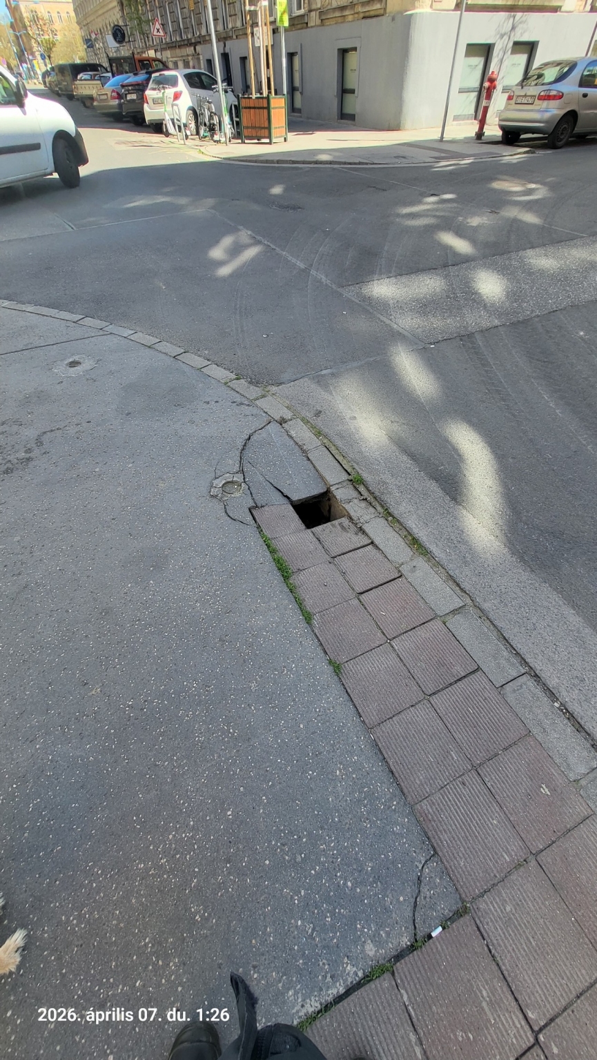 Budapest VII. kerületben a Hernád utca és a Péterfy Sándor utca sarkánál a TCN Sign Studio üzlet előtt beszakadt a járda.