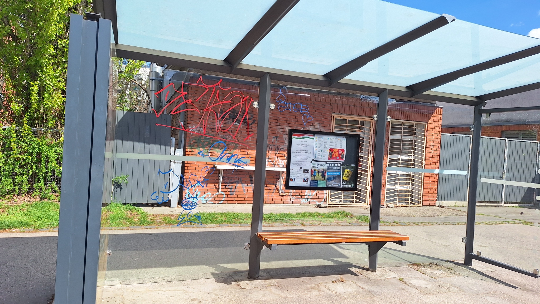 A 7-es busz Szent Imre Kórház megállójában a váró üvege össze van firkálva.