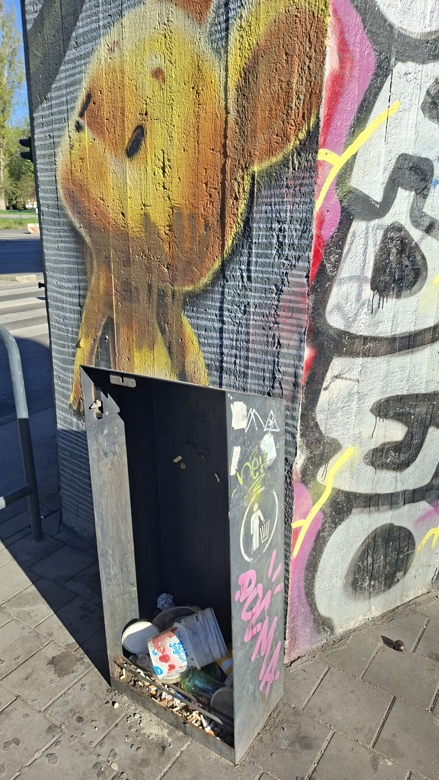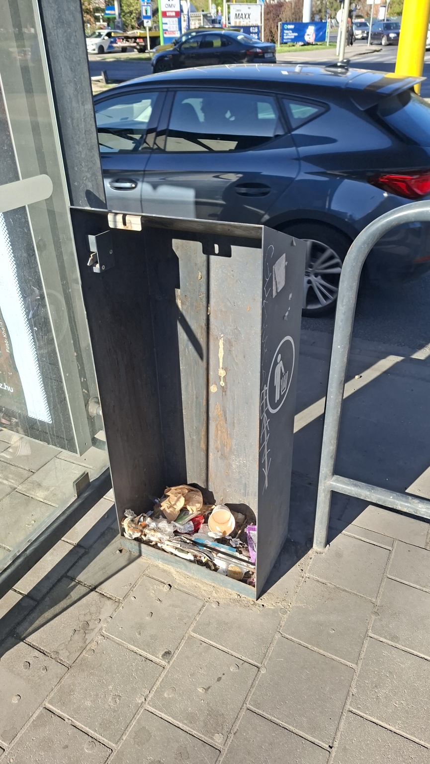A 17, 61 vilamos BAH csomópont megállójában a szemeteskuka szét van rúgva, verve, darabjai hiányoznak. Kérem egy új szemetes kihelyezését.