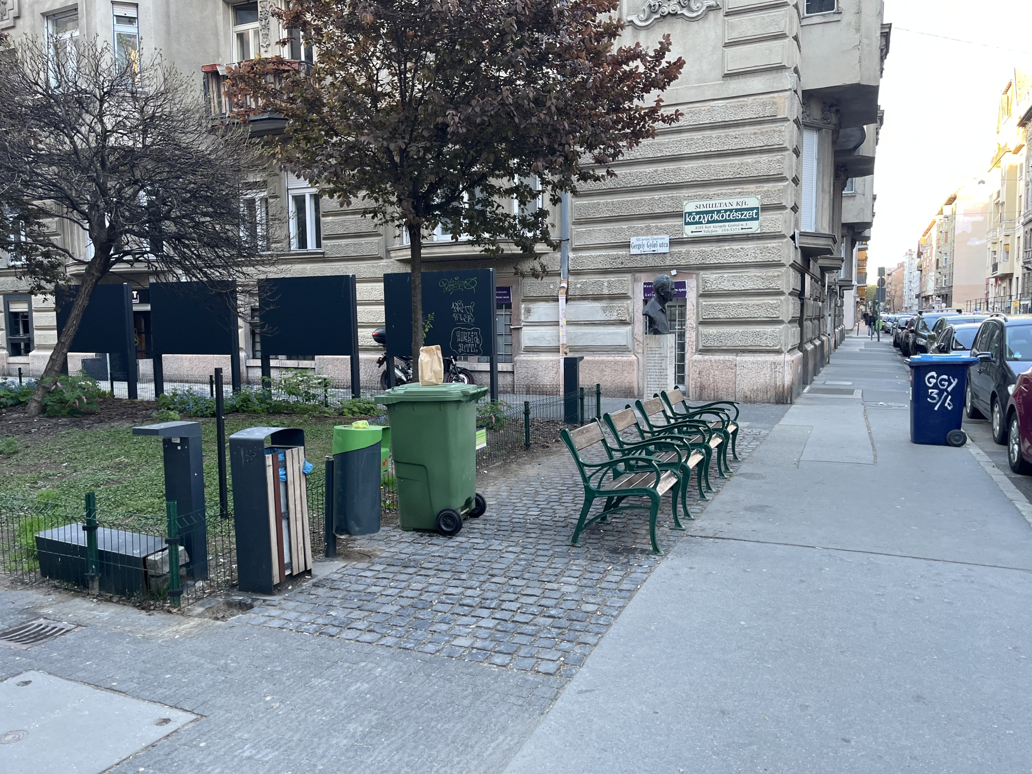 A Gergely Győző utca Pannónia utcai végénél lévő székeket a kerületi önkormányzat valamiért a járda és nem a kerítés vonalàba tette. Ez nemcsak furcsán néz ki, hanem az ott ülők és közlekedők zavarják egymást, a holt térben meg összegyűlik a szemét.