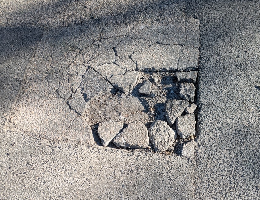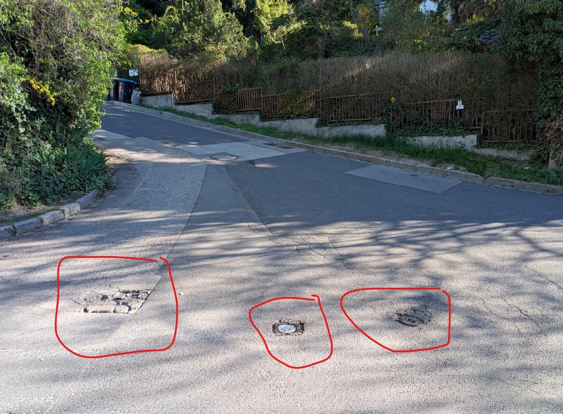 Budapest II. kerület Vöröstorony utca és Vöröstorony lejtő találkozásánál az úttest közepén kialakult egy csúnya kátyú. A kimozgó törmelék külön veszélyt jelet a járművekre. Ennek a közvetlen közelében van egy gáz- és vízelzáró fedél, és ezek mellett is elkezdett szétesni a burkolat. Jó lenne egyben a három szomszédos problémát kezelni. Lehet, hogy az elzáró fedélnél bitumen kiöntés is elég, de ezt majd eldöntik a szakemberek.