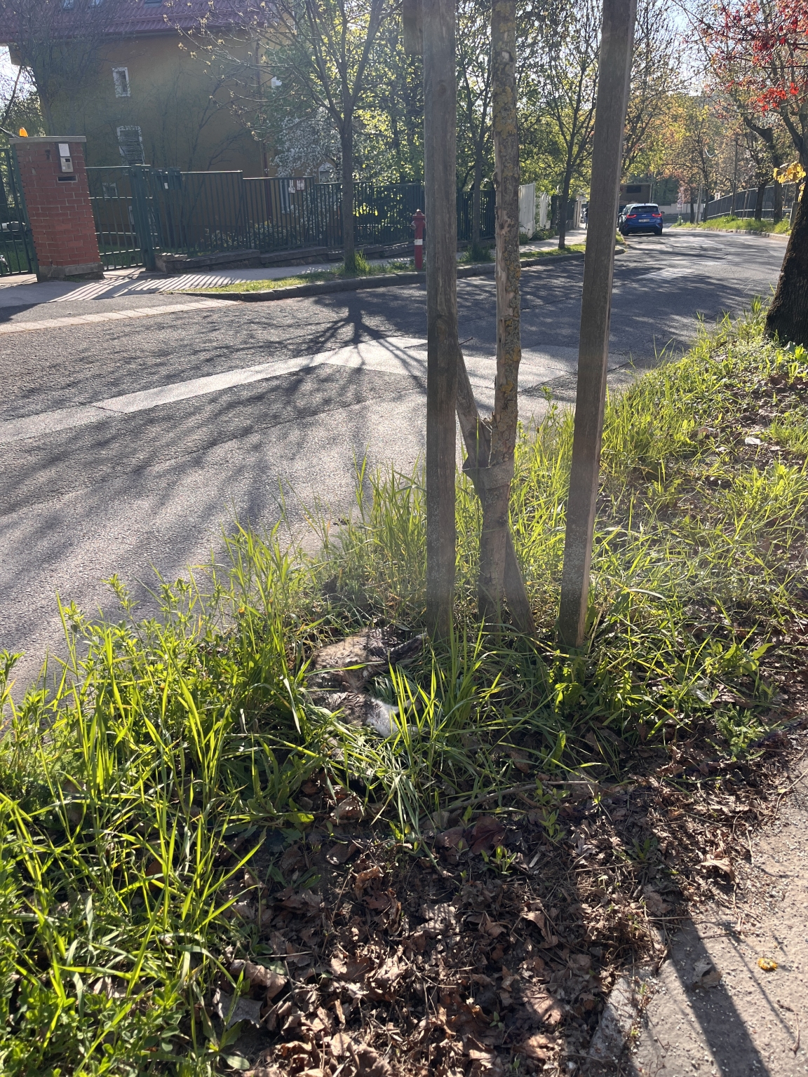 Macska tetem fekszik a Ferenchegyi úton a Czeizel intézet telkének kerítése mellett a járda melletti zöld sávban.
