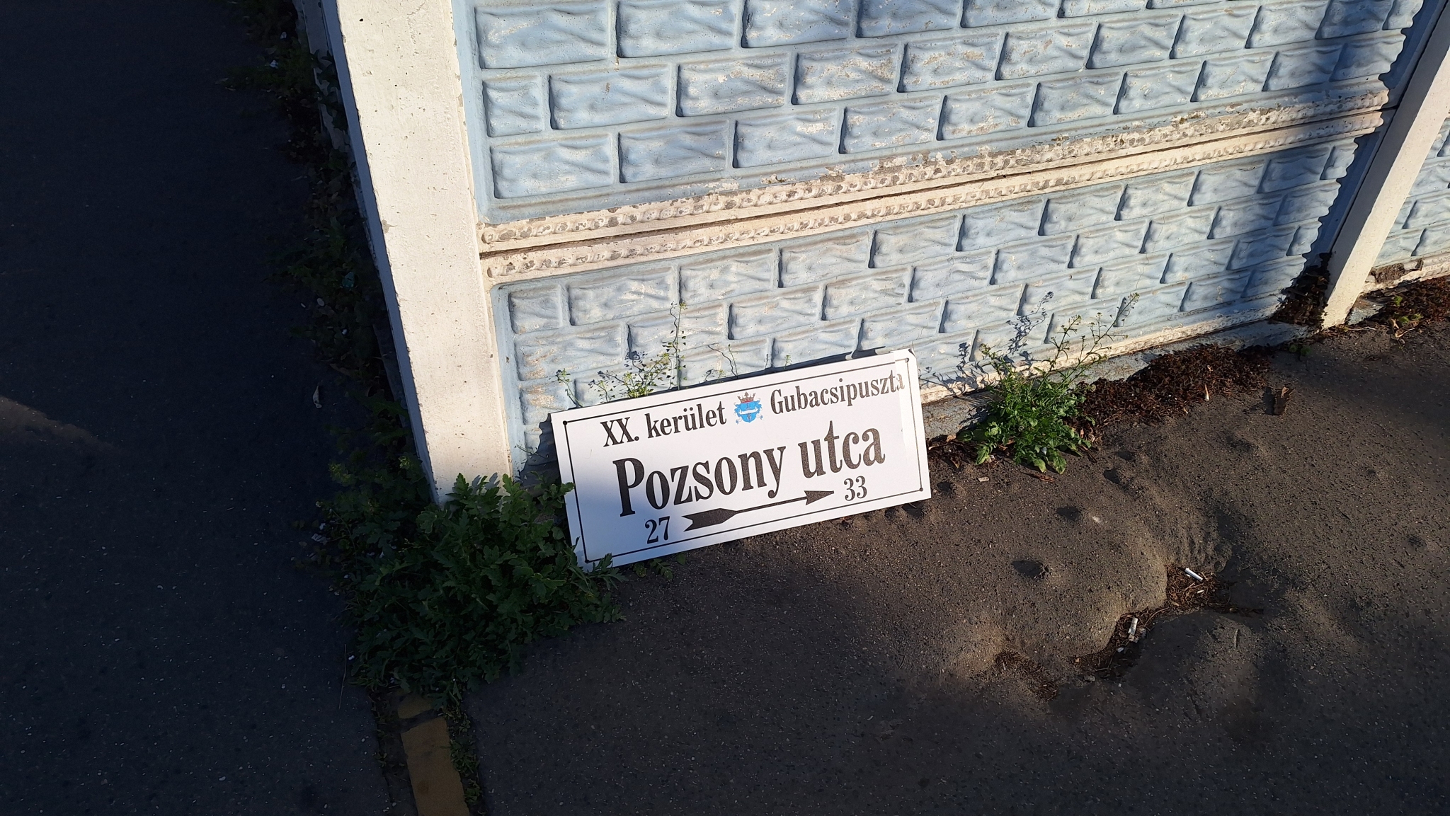 A Lázár és Pozsony utca sarkán a földön hever az egyik utcanévtábla.