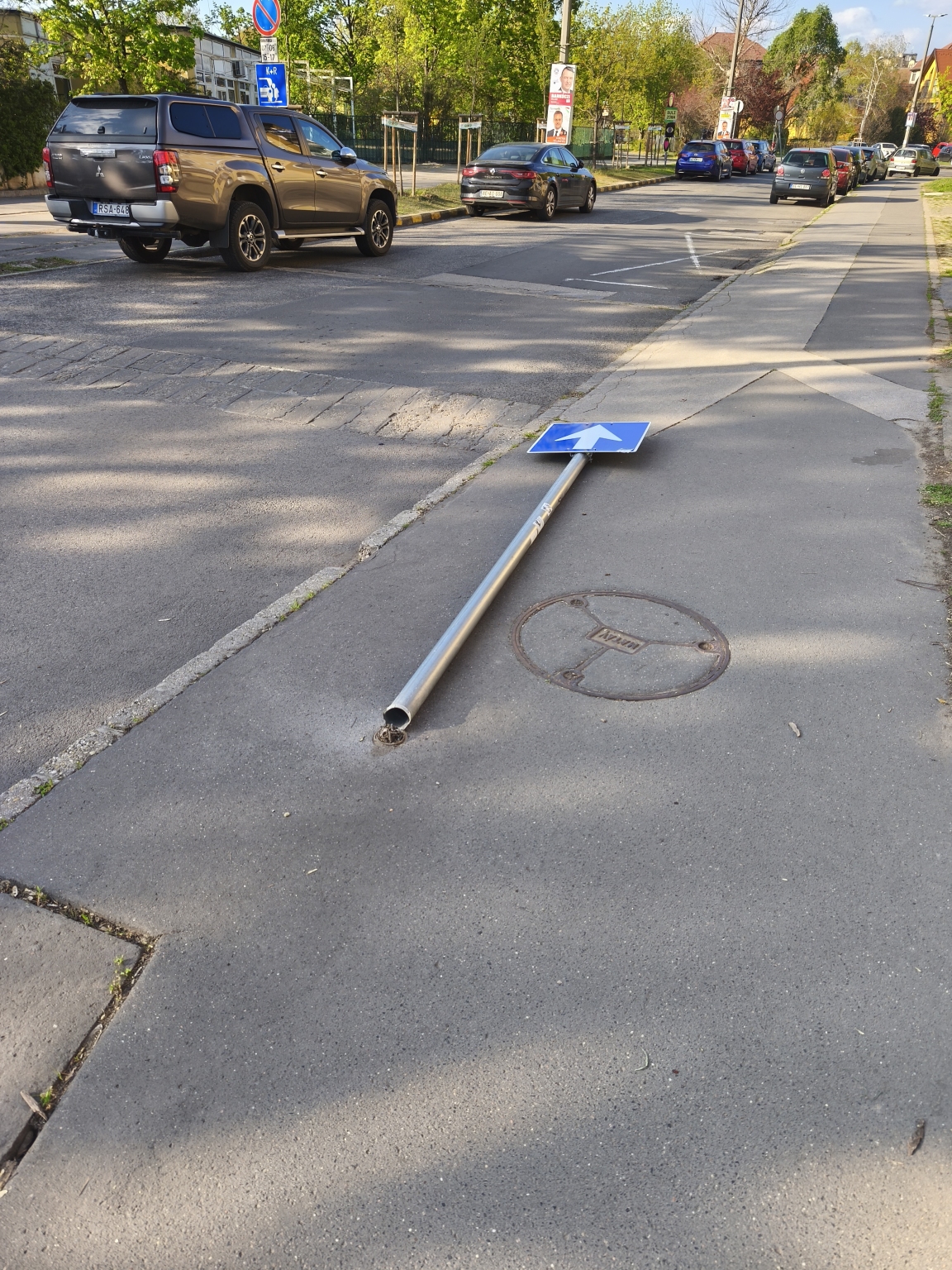 A hajló utcai iskolával szben van egy kidölt/tört közlekedési tábla
