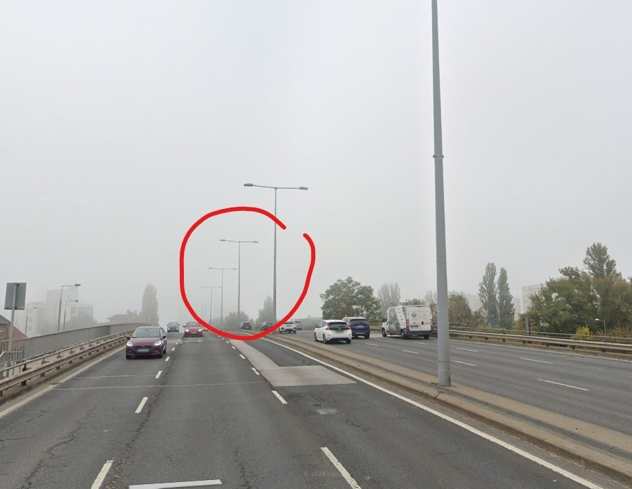 A Szentendrei úton a Bogdáni út után kifele a felüljárón már több mint 17 hónapja (több mint 500 napja) hiányzik két ostorlámpa, pont a felüljáró közepén, ami igencsak balesetveszélyes.