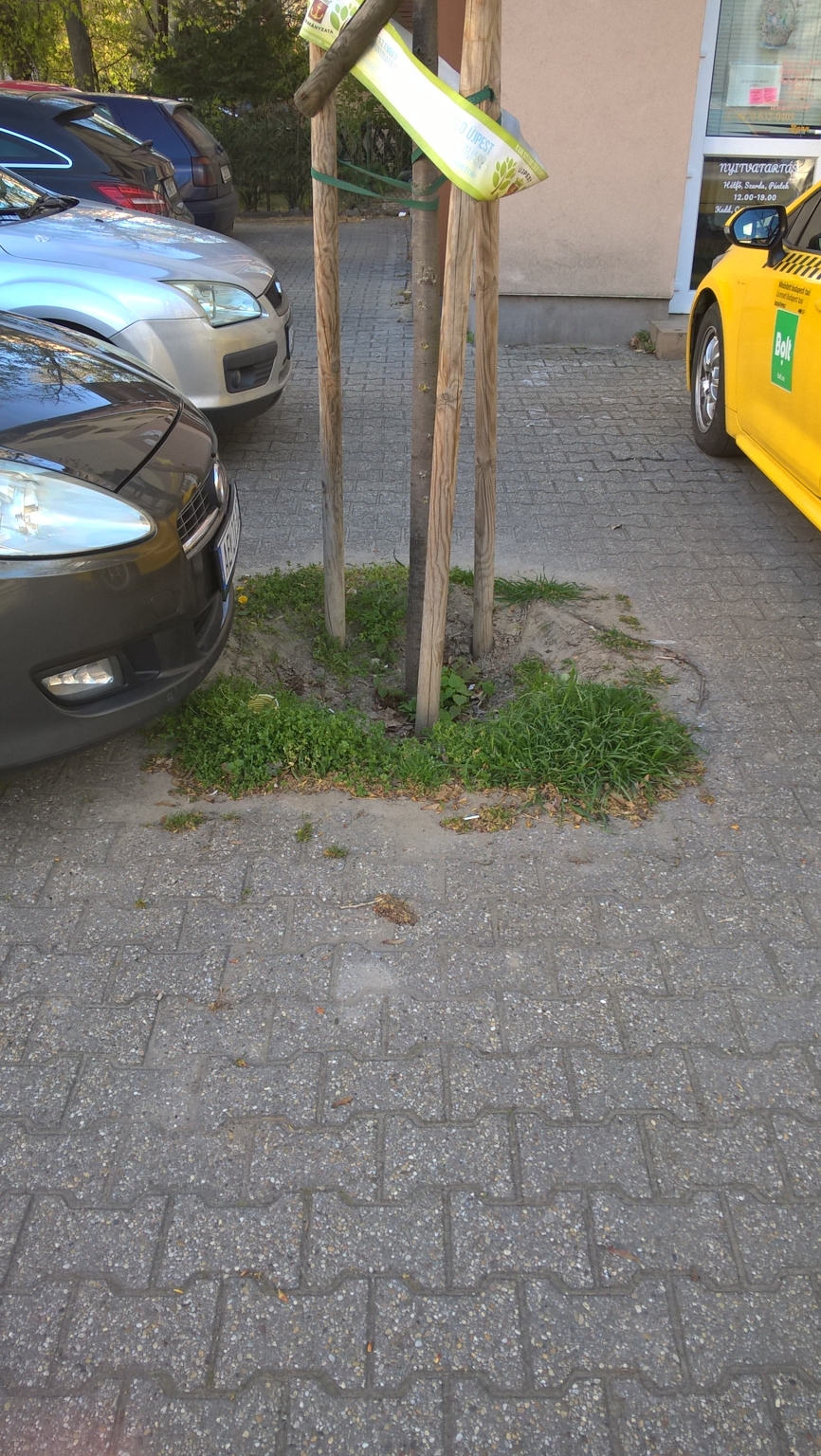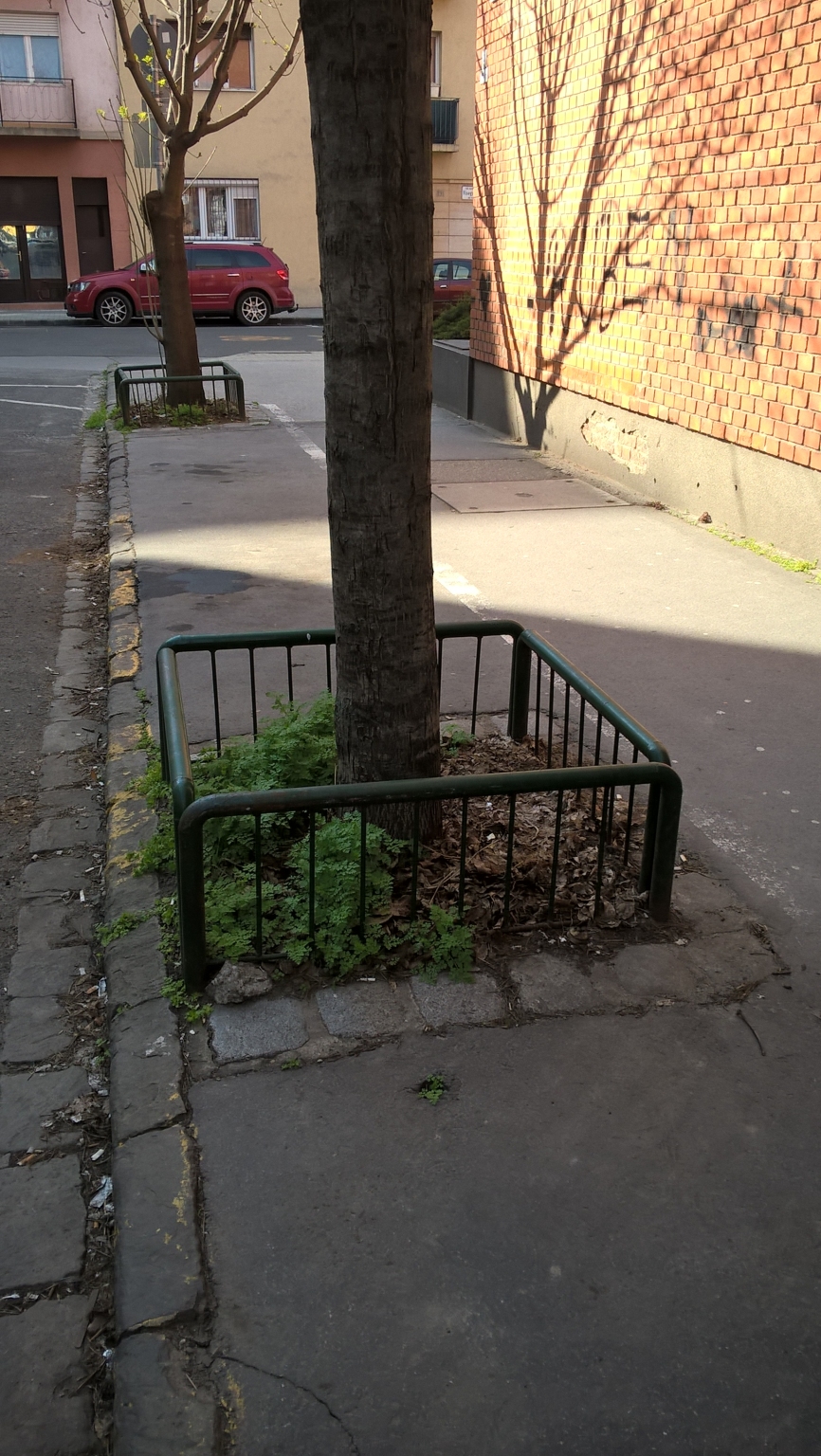 A XIII. kerületben az Alig utcában az összes fát favédő ráccsal körbevették és így megvédik őket a túl közel parkoló autóktól. A harmadik képen ez a megoldás látszik.