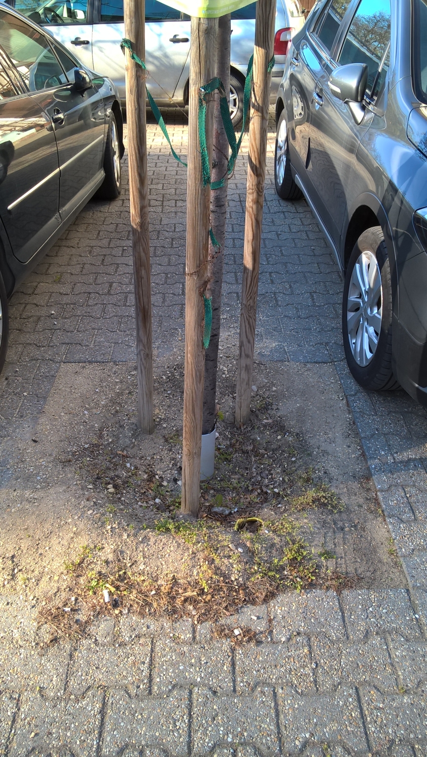 Egyes autók gyakran nagyon közel parkolnak a fákhoz. Az első két képen ez a probléma látszik. Az Ügető utcában a facsemetéket favédő ráccsal lehetne védeni. Ez különösen akkor lenne fontos amikor a fa három támasztékát az ültetés után néhány év elteltével eltávolítják.