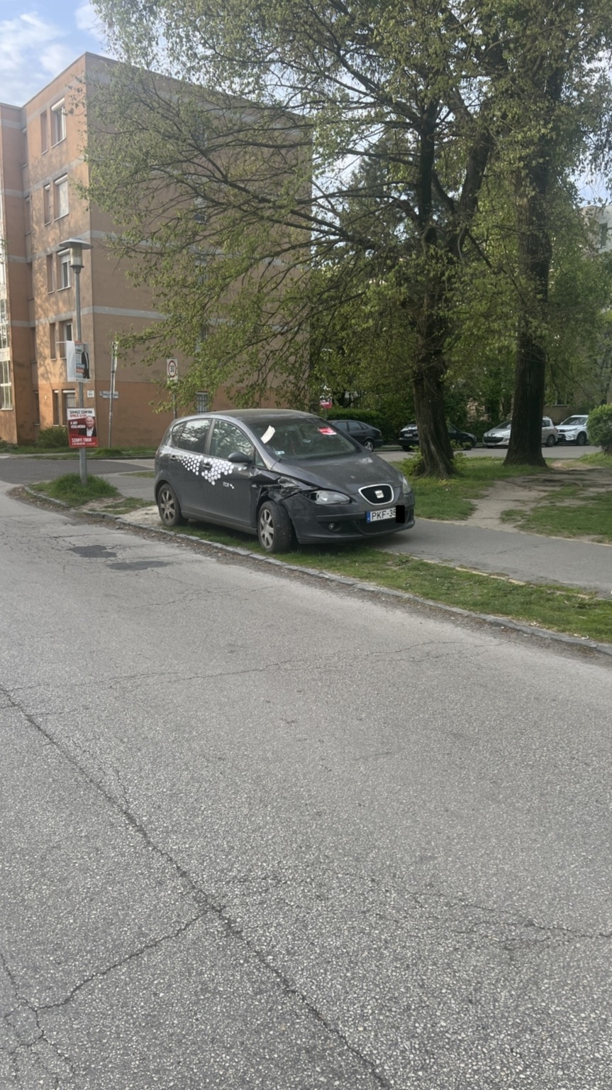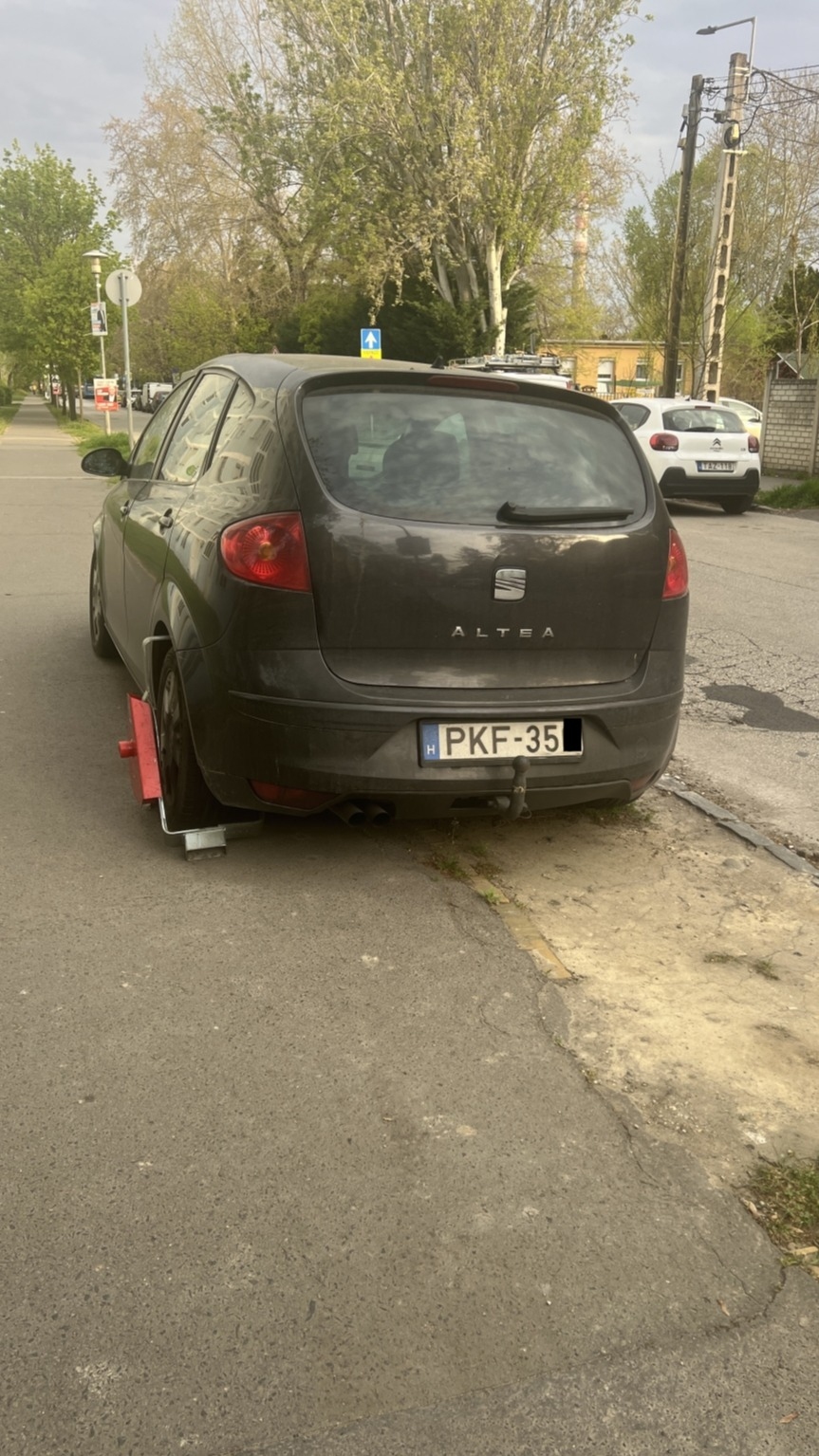 A járda szélén egy törött autó parkol hetek óta, már kerékbilincset is kapott de nem viszi el senki.