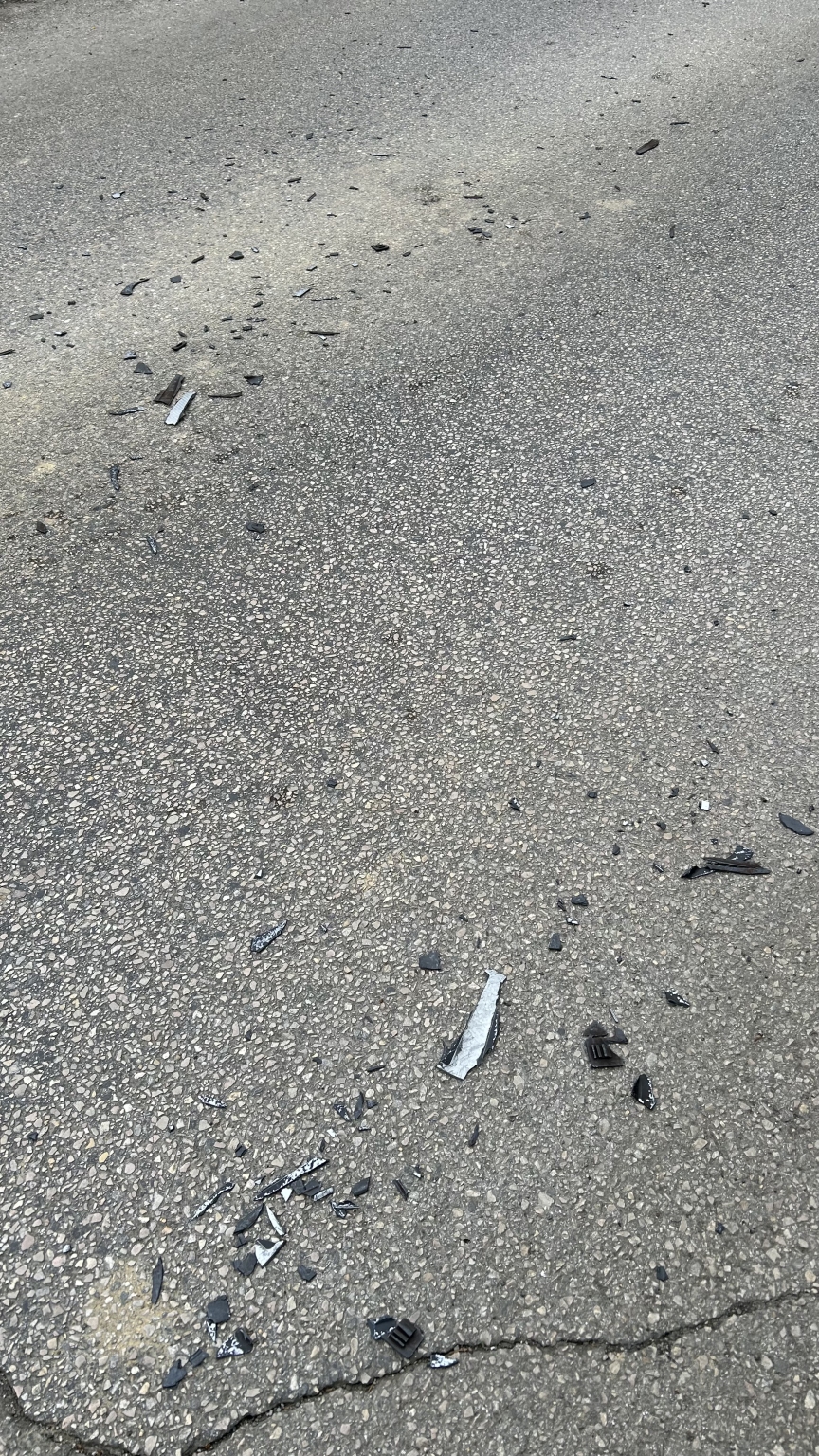 Műanyag darabokkal van teli a II. kerületben a Nyéki utca alja (Völgy utca - Nyéki utca sarok). Valami nagyobb dolog lehetett ami már darabokban van, és minden kocsi átmegy rajta.
