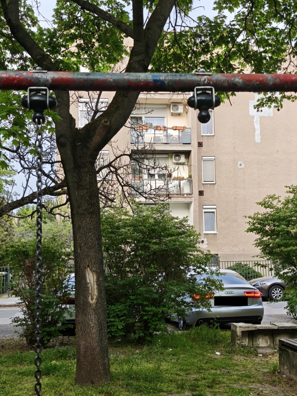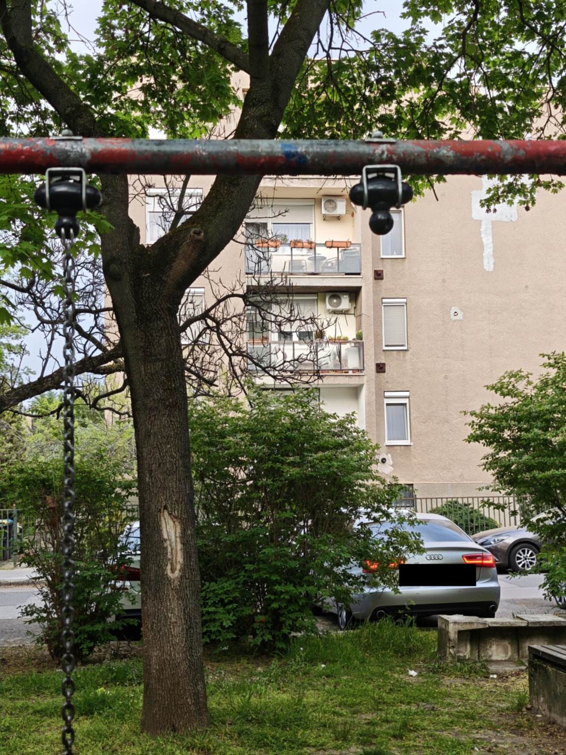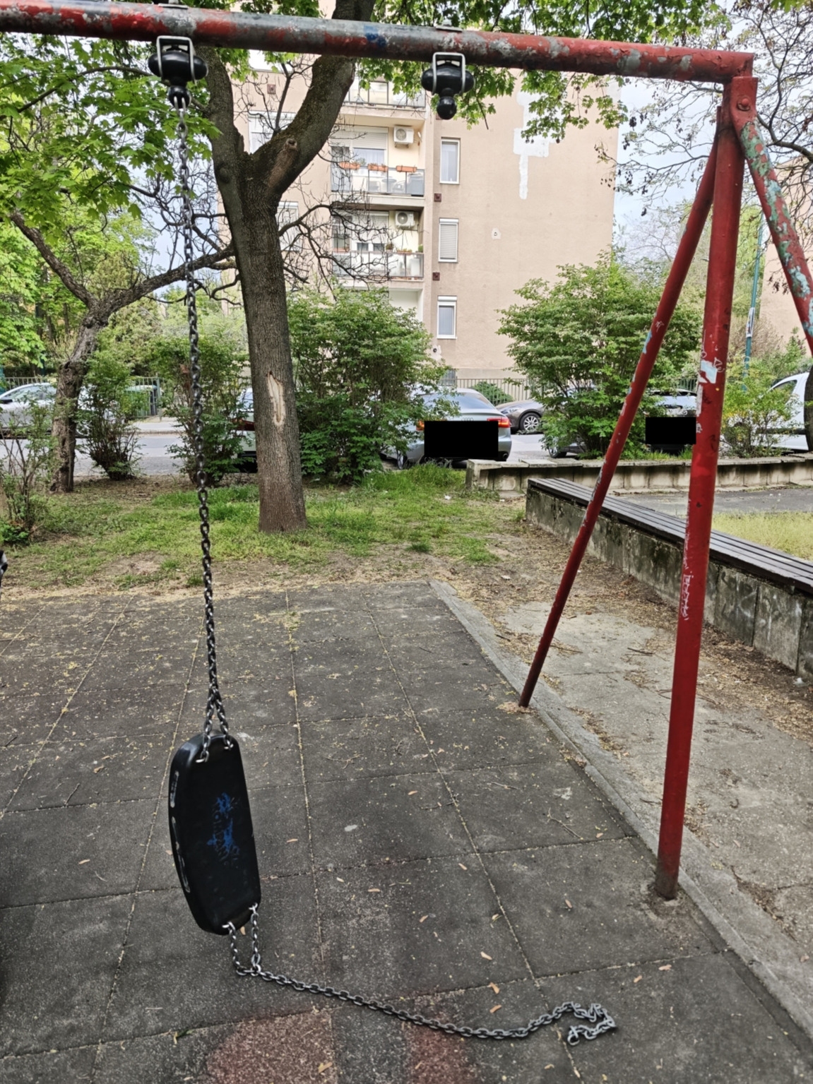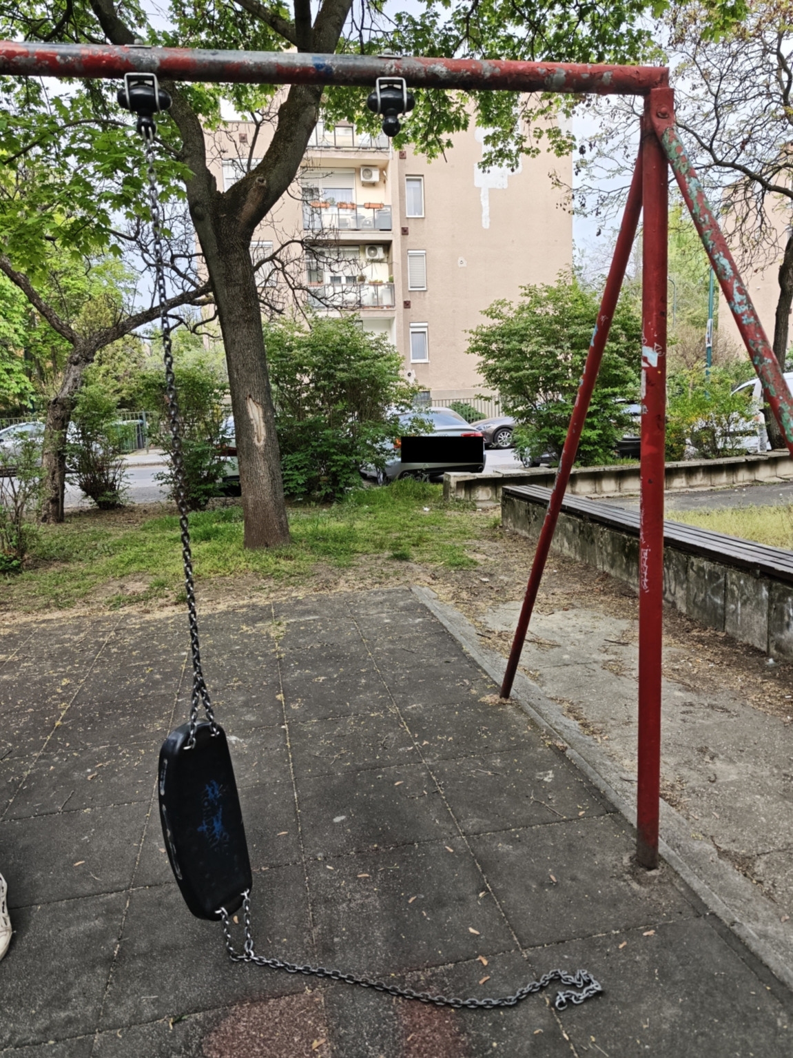 A 14.kerület Nagy Lajos király útja 87. szám mellett található "régi játszó" Google térkép megnevezésű játszótéren a hinta leszakadt javítása szükséges, rögzítő kampója hiányos.