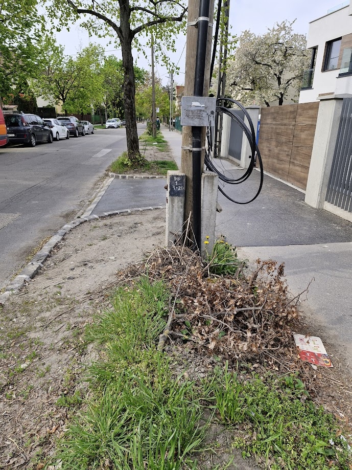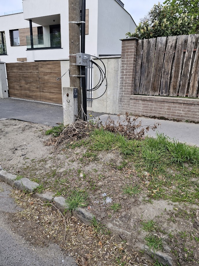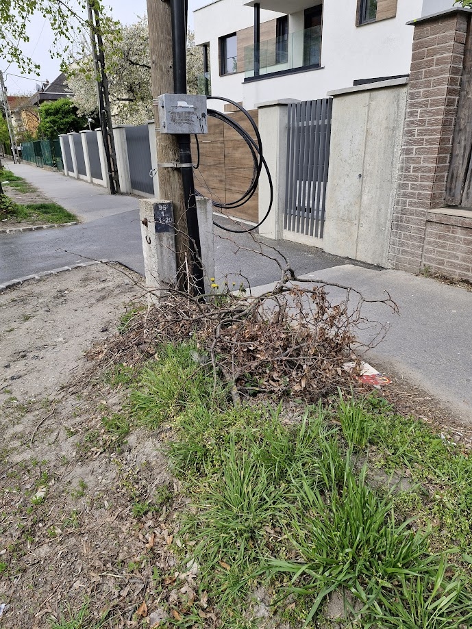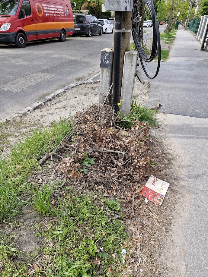 A friss építkezés előtt nagy ágkupac gyűlt össze. Kérjük a terület megtisztítását.