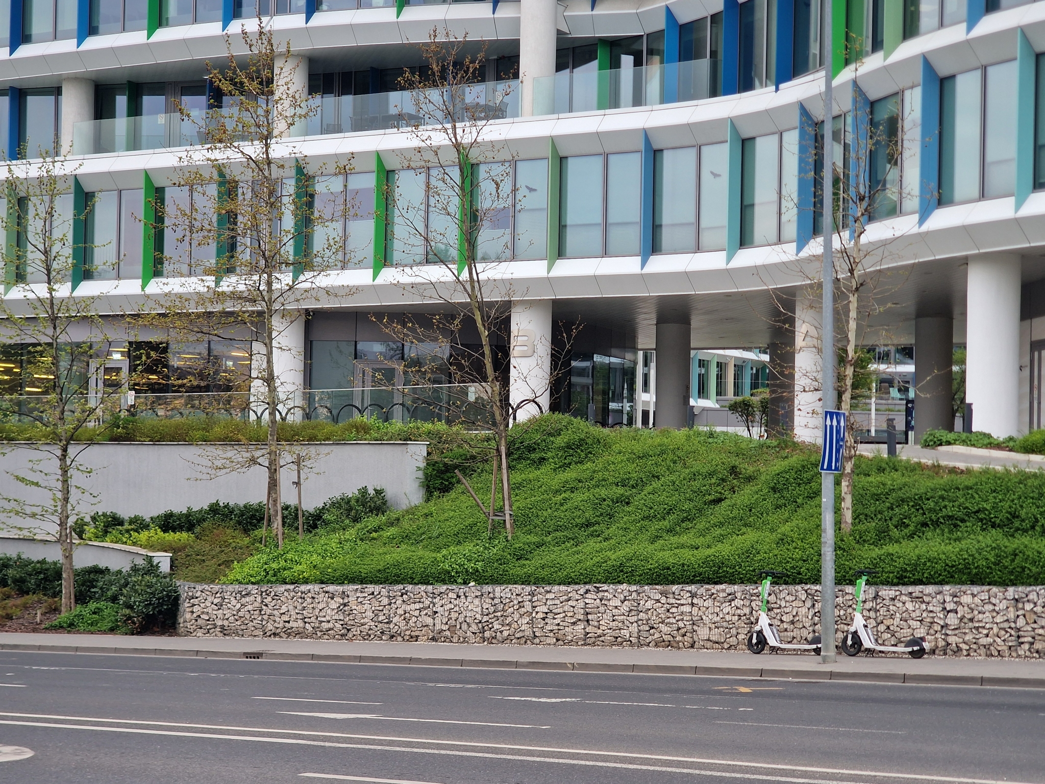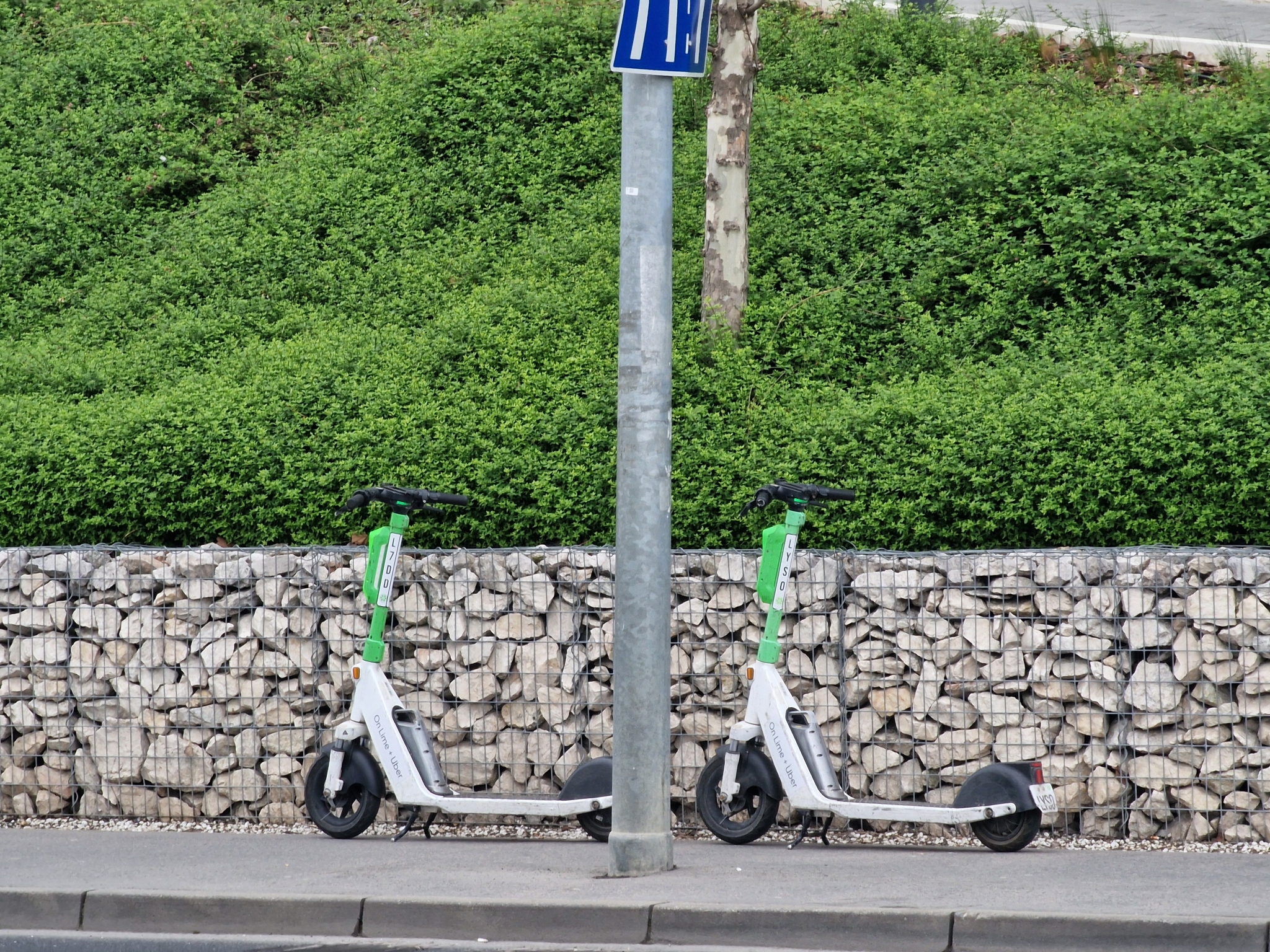 Ezen a járdán két ember épp hogy elfér egymás mellett. Korlát nincs, ami védené a gyalogost attól, hogy a közvetlenül a járda padka mellett a buszsávban száguldozó buszoktól védve legyen. Még villanyoszlopok is szűkítik a járdát és pont ott, ahol a villanyoszlop van, muszáj volt két közösségi rollert ott hagyni. Kb. 100 méterre ott van a rollerek számára kialakított mikromobilitási pont. Miért nem lehetett a rollereket elvinni odáig?