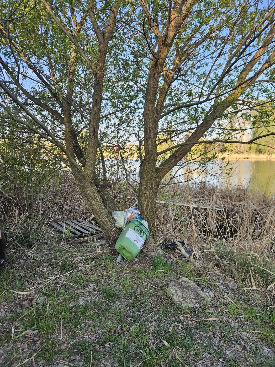 A vízparton be van döntve egy szeméttel teli kuka a fához, ami valószínűleg nem is ide tartozna, mert nem nagyon látni más ilyen kukát a környéken.