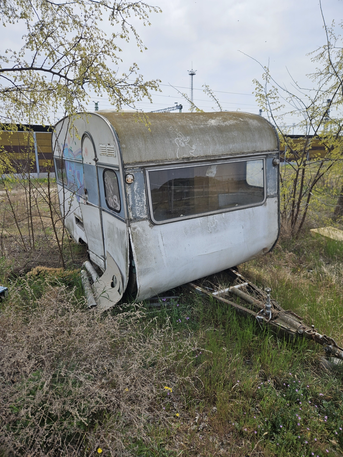 Ez a lakókocsi már nagyon rossz állapotban van, látszik, hogy régóta itt van, és senki nem foglalkozik vele. Több helyen szét is van már törve. Rendszámot nem láttam rajta.